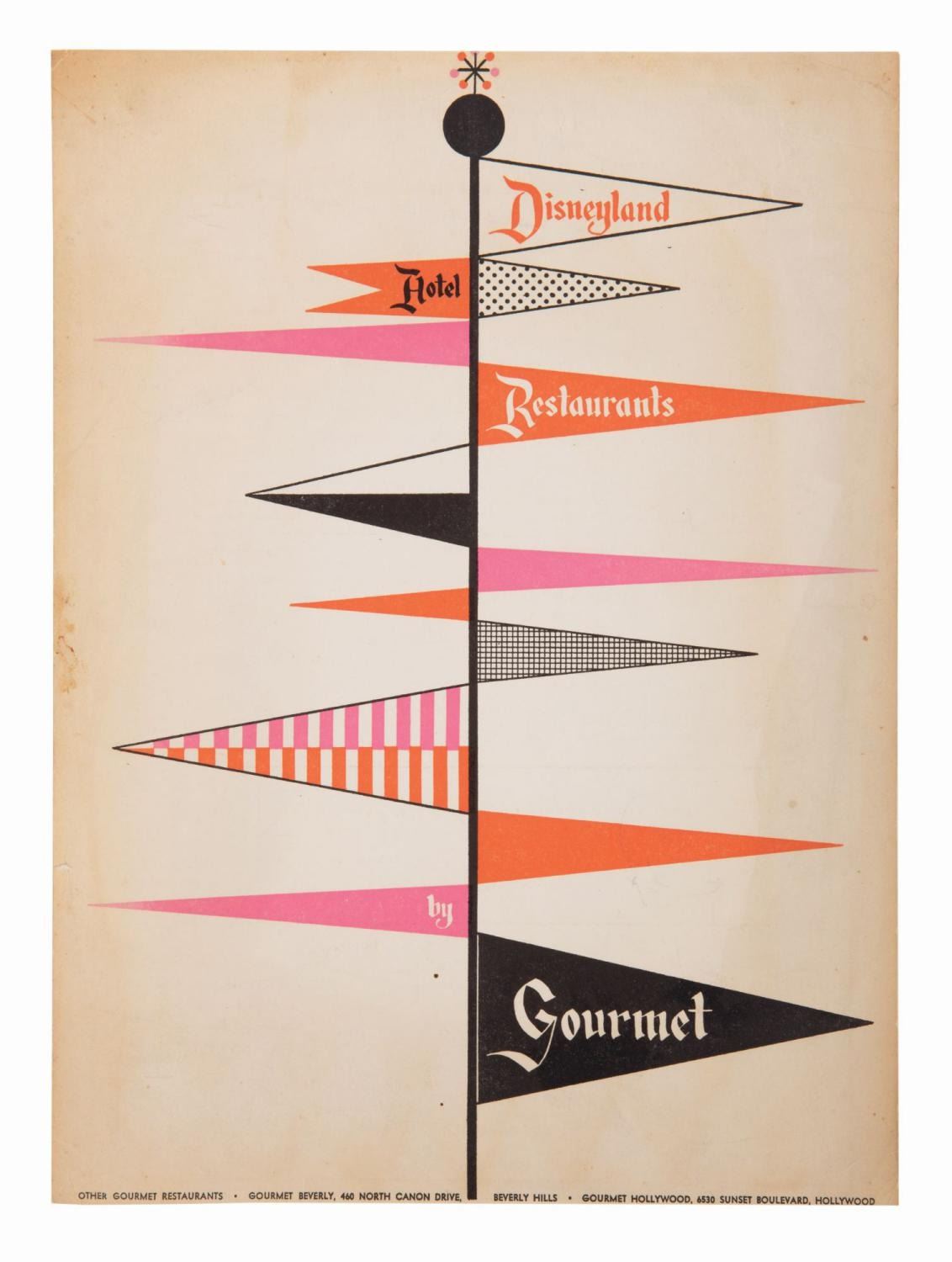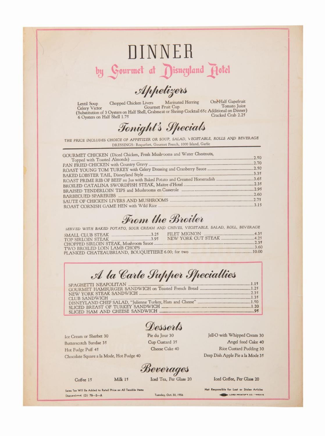 (Disneyland Hotel, 1956) A very rare early dinner menu from the Disneyland Hotel. This Disneyland Hotel Restaurants by Gourmet menu features a printed date of Tuesday, Oct. 30, 1956 below the specialties for the day such as the "Braised Tenderloin Tips" and "Disneyland Chef Salad." The double-sided menu measures 14.25"x10.5" and is in good condition with yellowing and handling wear, particularly at the edges, and small creases throughout.