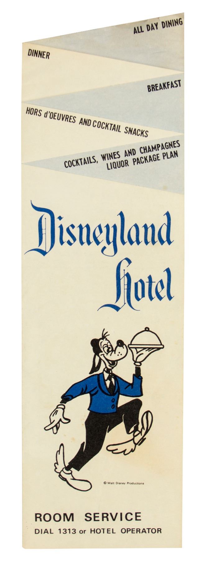 (Disneyland, 1970s) An unusual room service menu from the Disneyland Hotel. This is a 5-fold menu that opens up accordion-style with a great image on the cover of Goofy as a server. The menu measures 15.25"x4.5" folded and is in good condition with some creasing to the top-right corner.