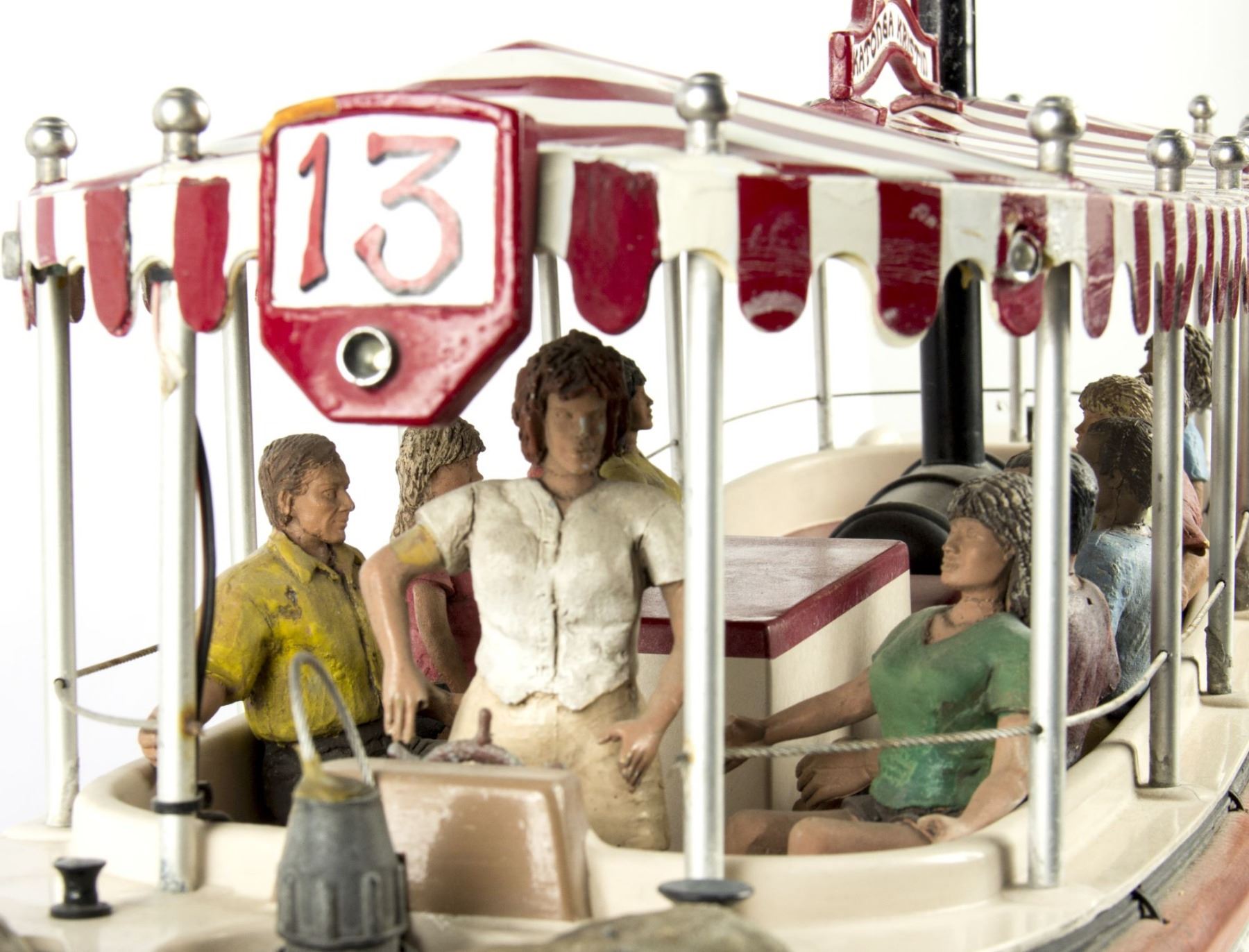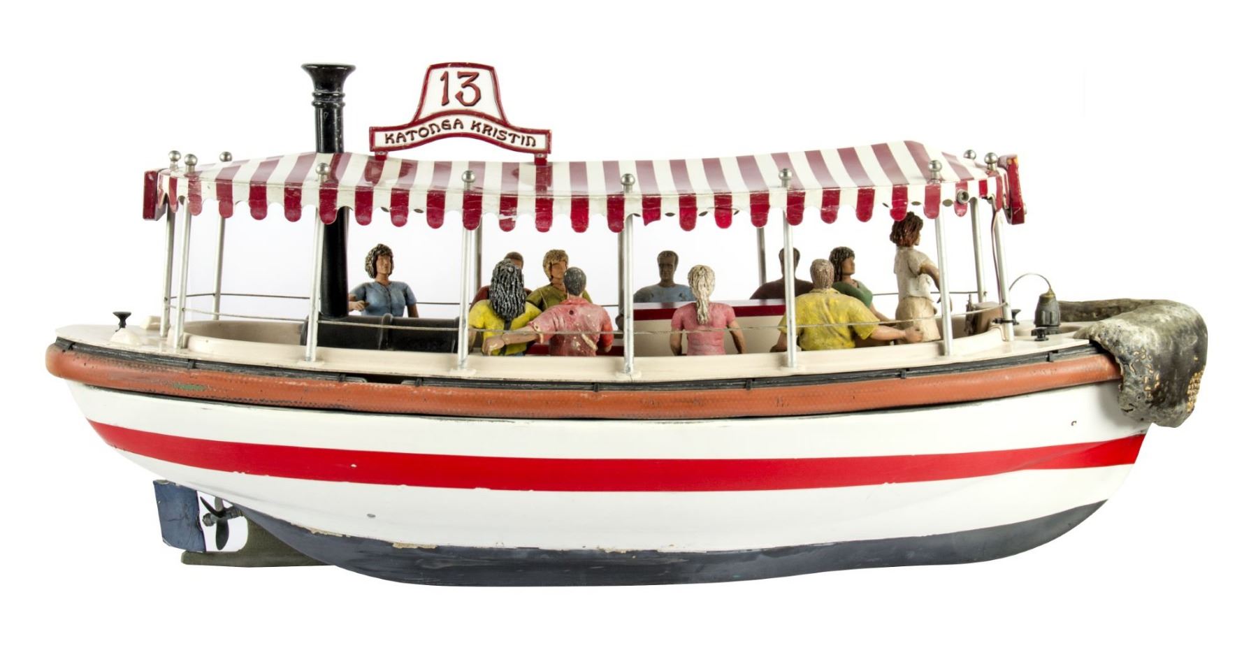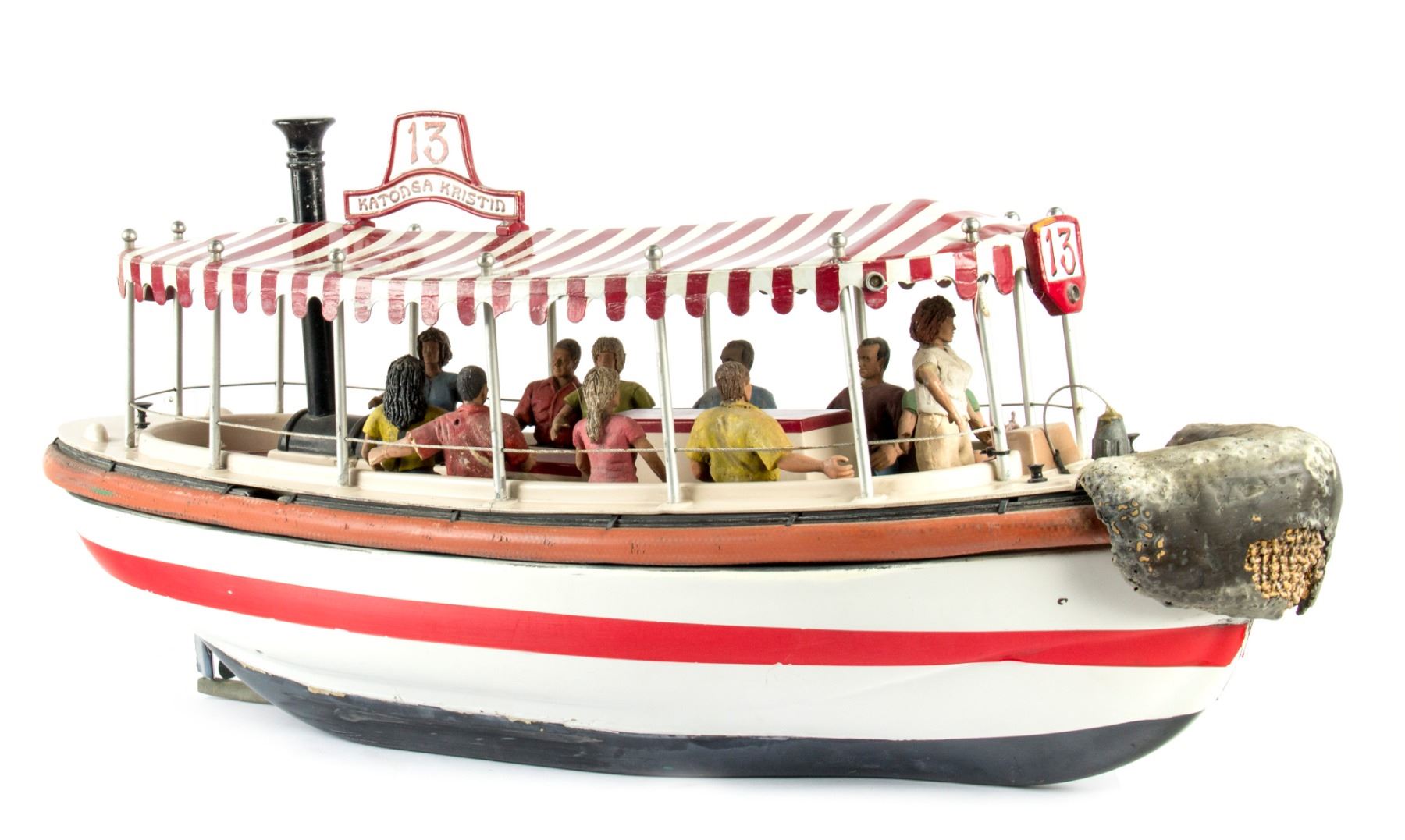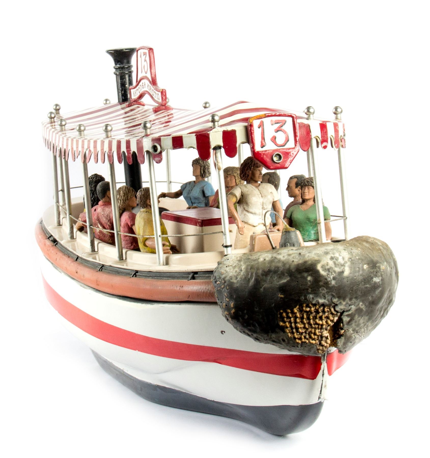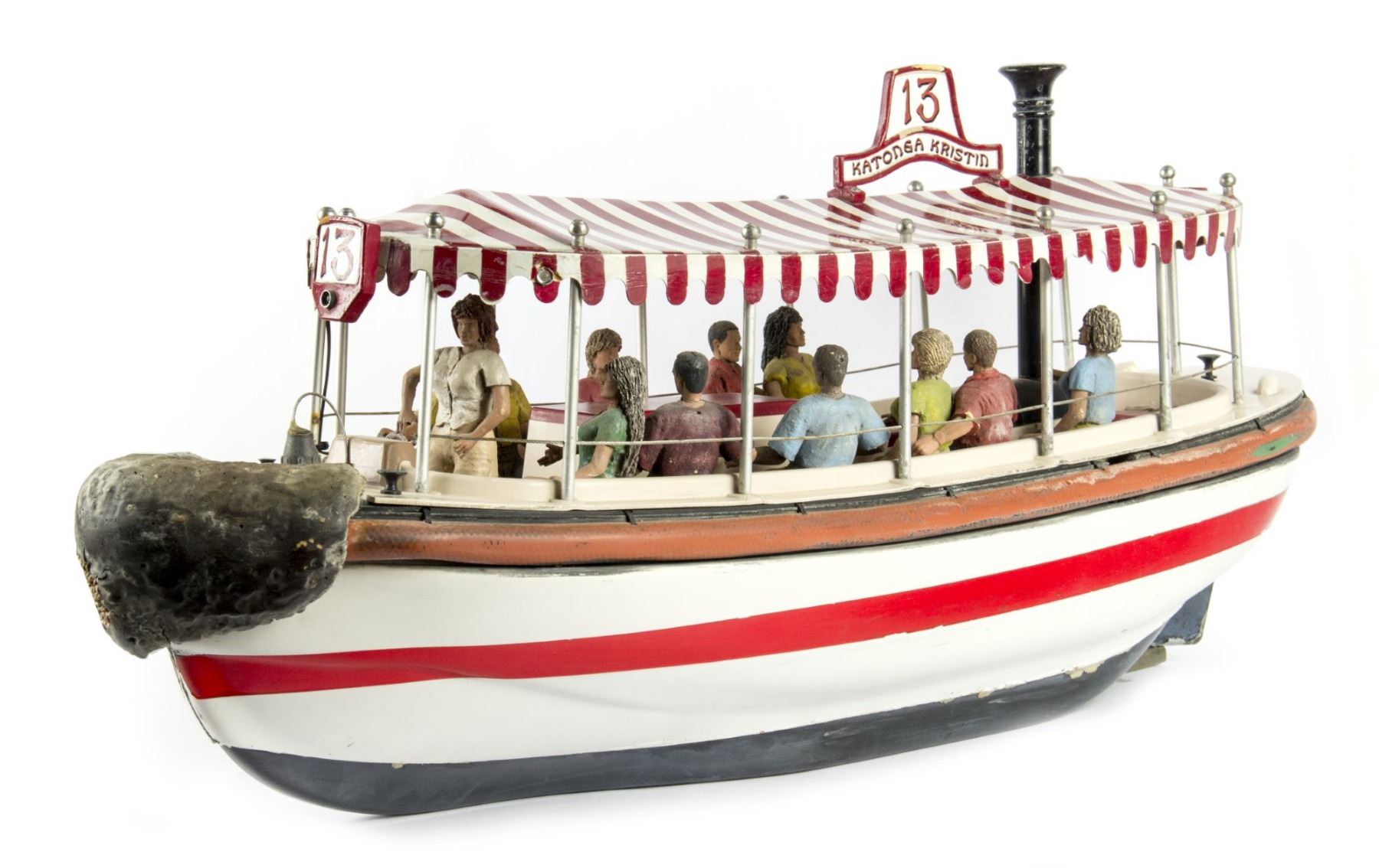 (Disneyland, c.1999) A beautiful remote controlled boat from the coin-operated Safari Adventure boats at the Disneyland Hotel. This faithful replica of a "Jungle Cruise" boat is named the “Katonga Kristin†and still retains its vibrant color and most of its passenger figures. Within the Safari Adventure, skilled guests could maneuver these boats through targeted locations to set off interactive elements. This boat has seen many entertained, and no doubt a few frustrated pilots over its life before the Safari Adventure closed in 2010. The boat measures approximately 35"x10" and 16†tall, and is in very good condition with expected wear from use and age. Functionality has not been tested.