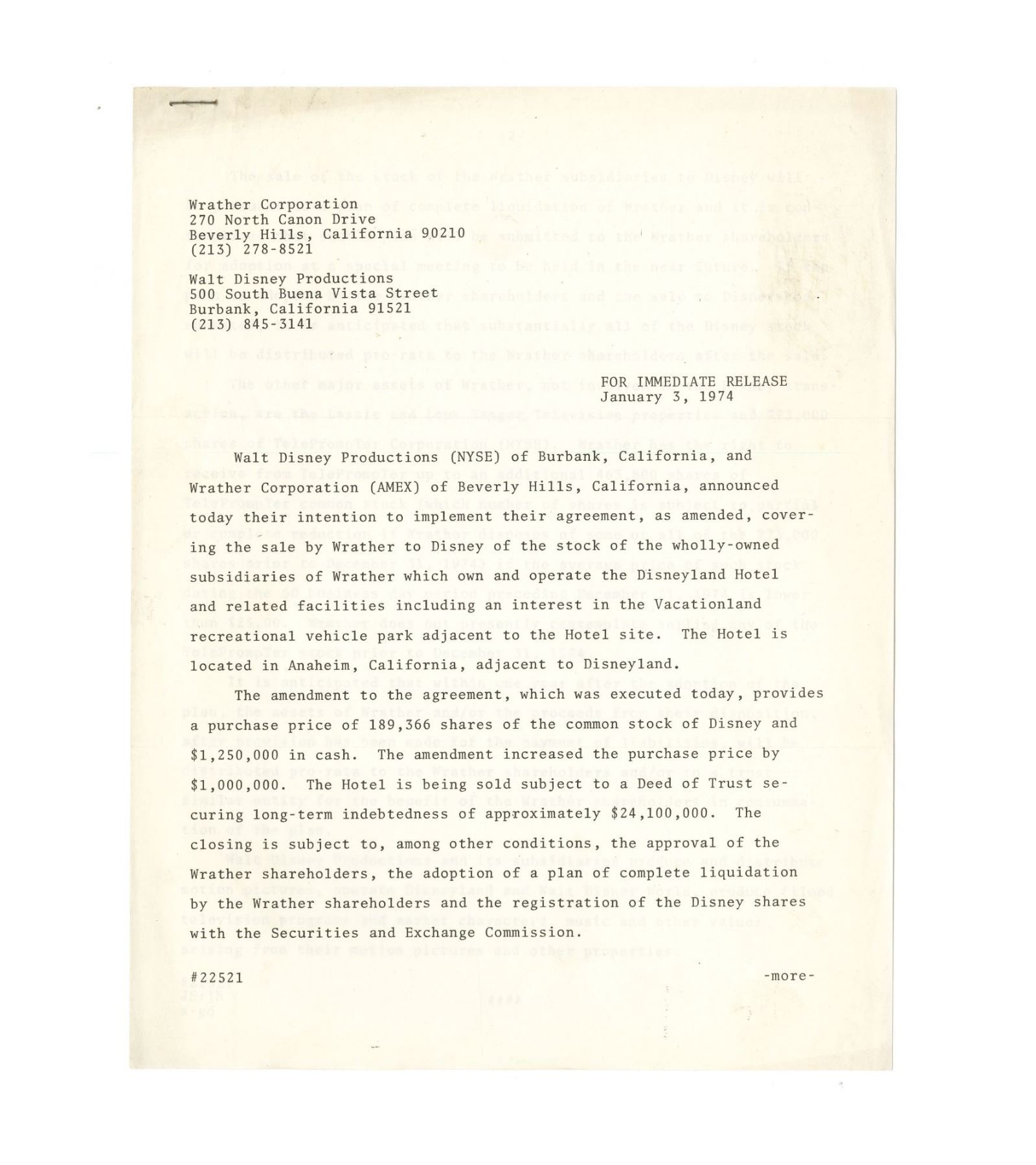 (Disneyland, 1974) An incredibly rare press release document from both Walt Disney Productions and the Wrather Corporation relating to the purchase of the Disneyland Hotel. During the construction of Disneyland, Walt knew that for his park to become a successful vacation destination, he would need to provide a comfortable lodging experience for guests in an otherwise fairly remote area of California. With his funds tied up in the construction of the park, Disney turned to Jack Wrather and Wrather Corporation who would build, manage, and own the only Hotel on Disney property. The Disneyland Hotel opened its doors on October 5, 1955, less than 3 months after the opening of the park. Disney would eventually buy the Wrather Corporation and with it, the Disneyland Hotel. However, this document refers to a much earlier attempt by Disney to purchase the Disneyland Hotel from Wrather Corporation between 1973 and 1974. This agreement would have provided a purchase price of 189,366 shares of the common stock of DIsney, and $1,250,000 in cash. While the deal would ultimately be unsuccessful, this incredible 2-page document shows Disney's early desire to own and operate the Disneyland Hotel themselves. Measuring 11"x8.5", the document is in very good condition with some edge-wear from use.