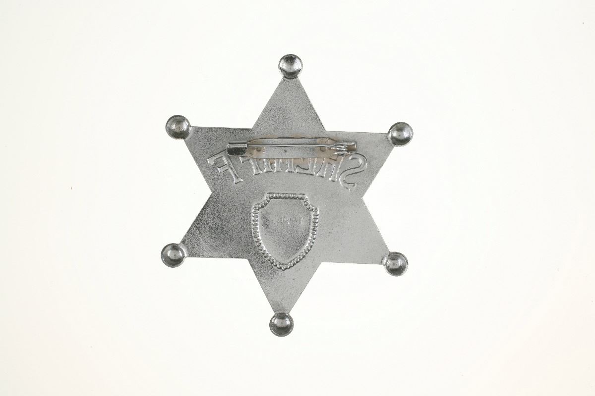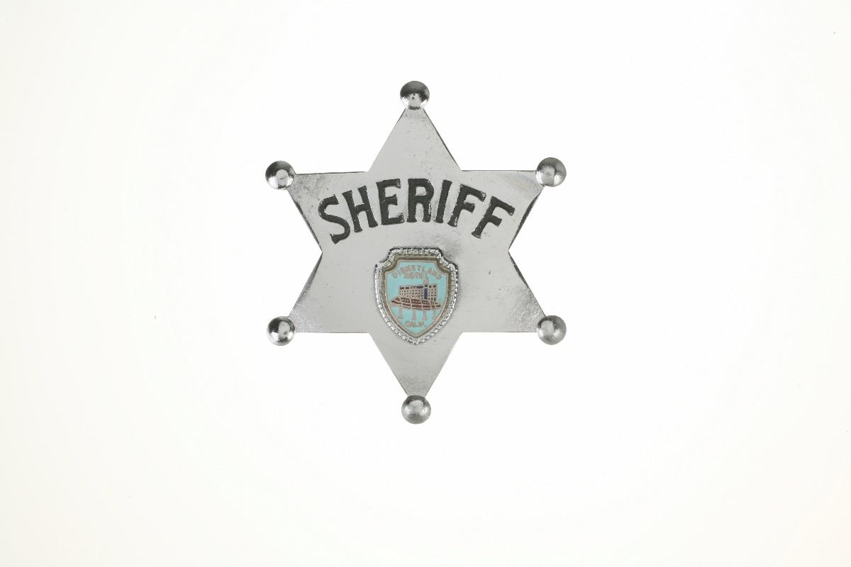 (Disneyland, 1950s) Sheriff's badge featuring the Disneyland Hotel's crest on the front. Measures 2.5"x2.5". In good condition with minor wear.
