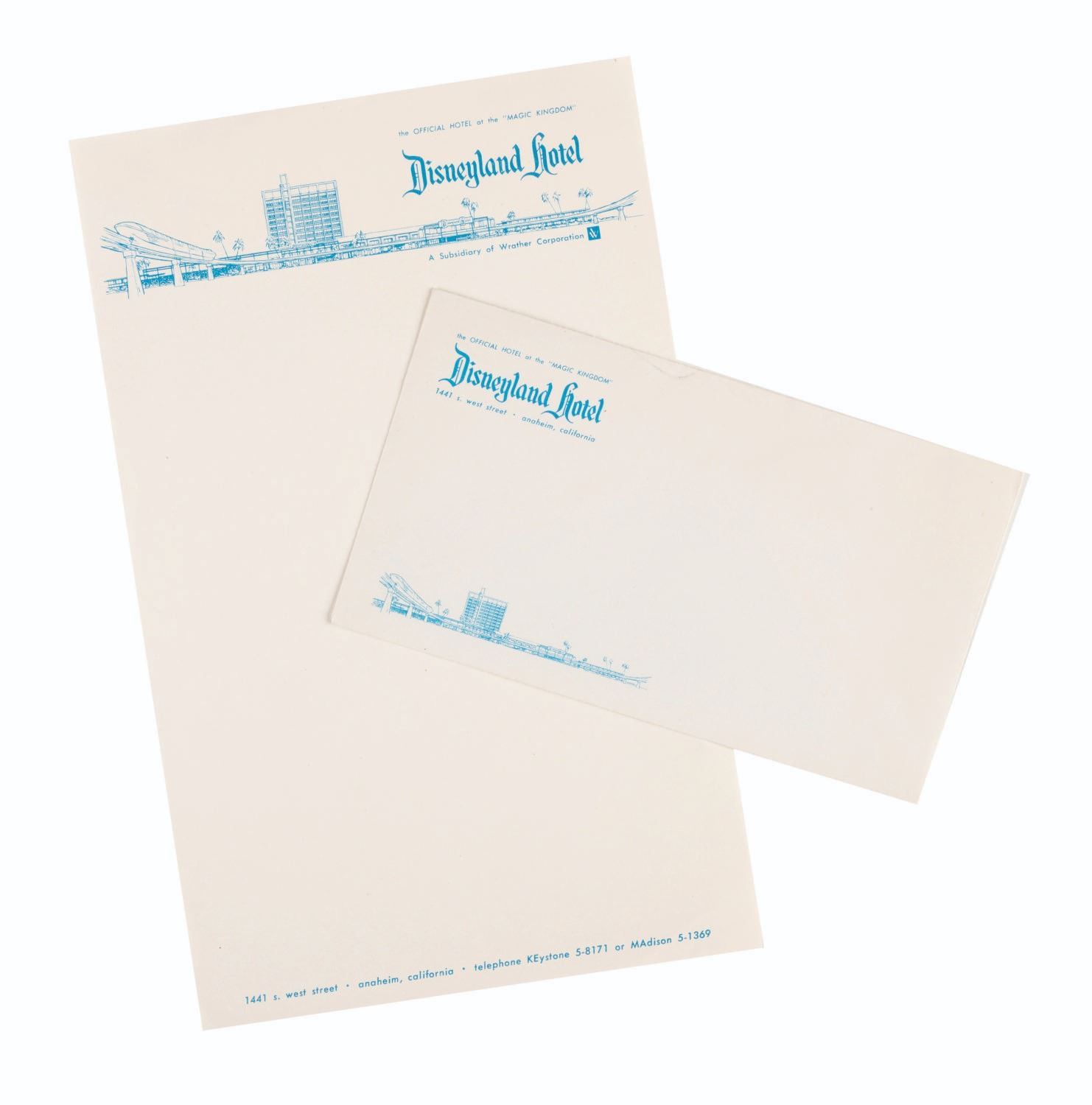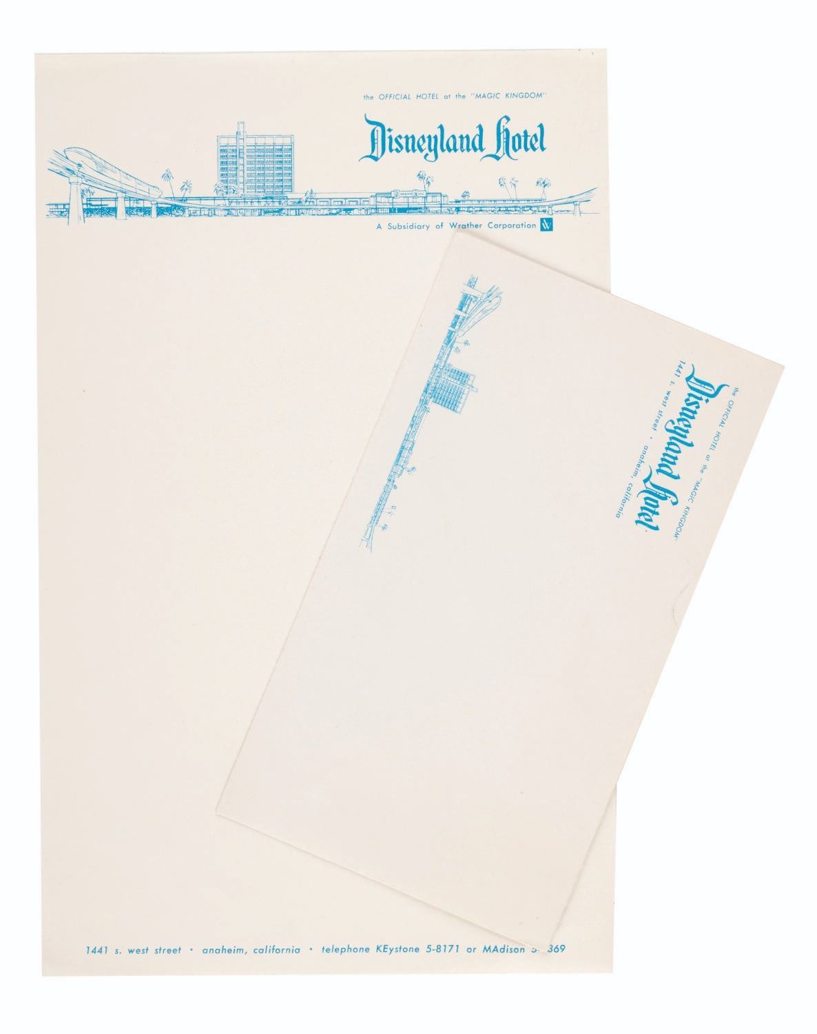 (Disneyland Hotel, 1961-65) A piece of stationery and an envelope from the Disneyland Hotel. Measuring 6" x 9.5" and 6.5" x 3.75", this set of unused complimentary stationery is in very good condition with small markings and minor wear.
