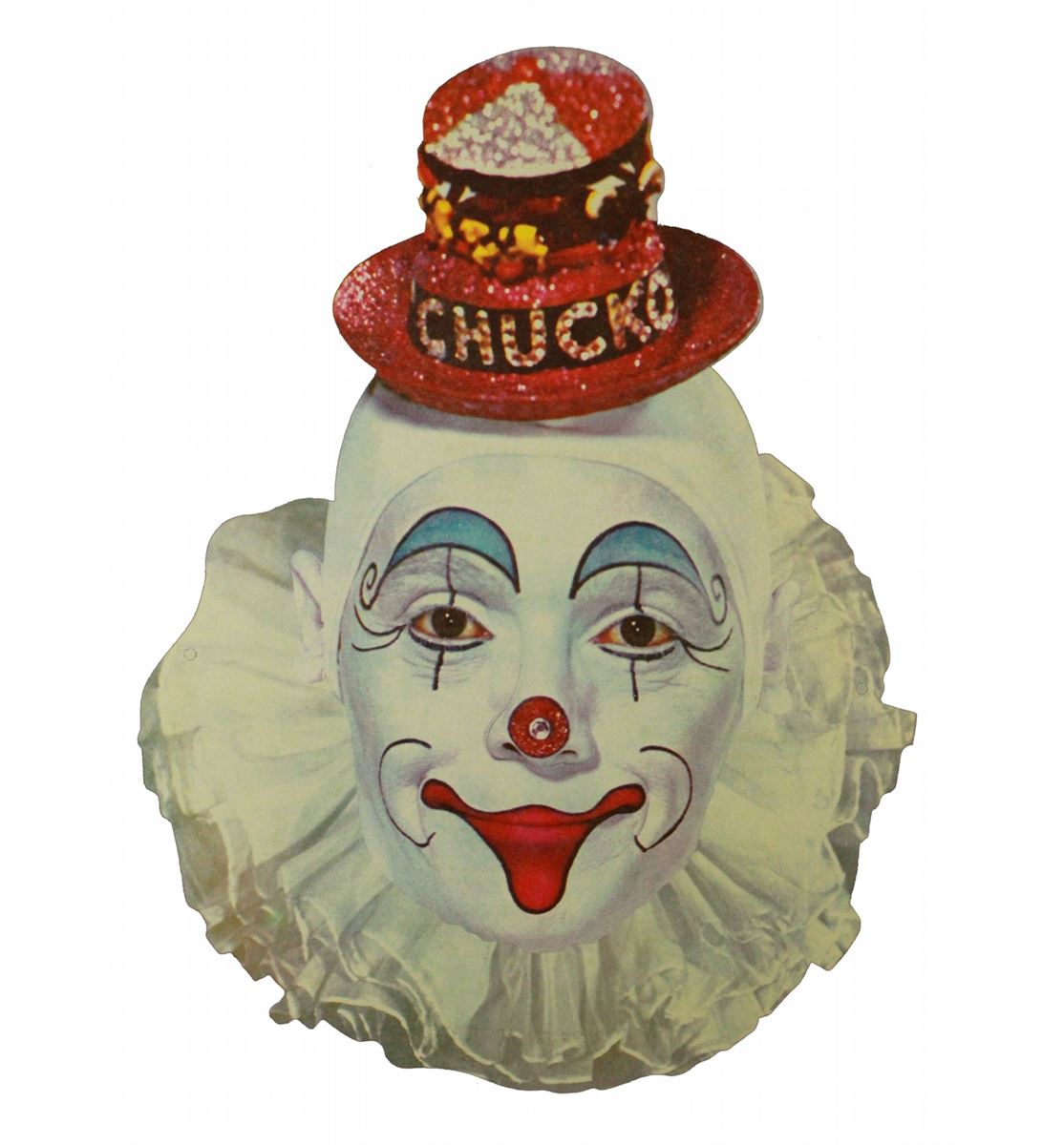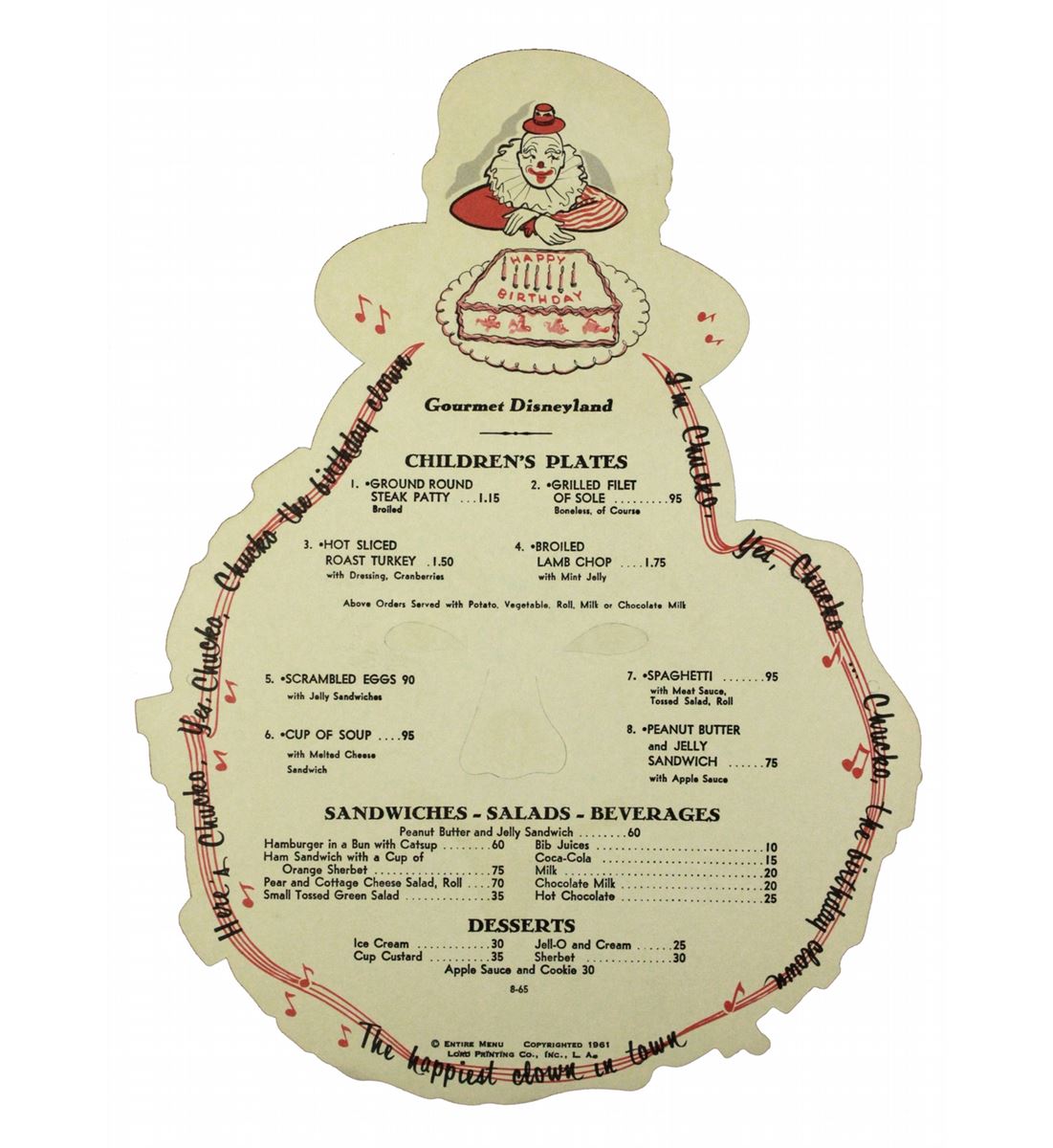 (Disneyland, 1961) Rare children’s menu from the Gourmet Disneyland restaurant at the Disneyland Hotel. The unused menu features the image of the early Mickey Mouse Club and occasional Disneyland performing character, “Chucko the Clown”. Chucko was played by early adult Mouseketeer, Bob Amsberry. The nose and eyes could be punched out and the menu worn as a mask. Measuring 11.5 x 9 in. and in very good condition.