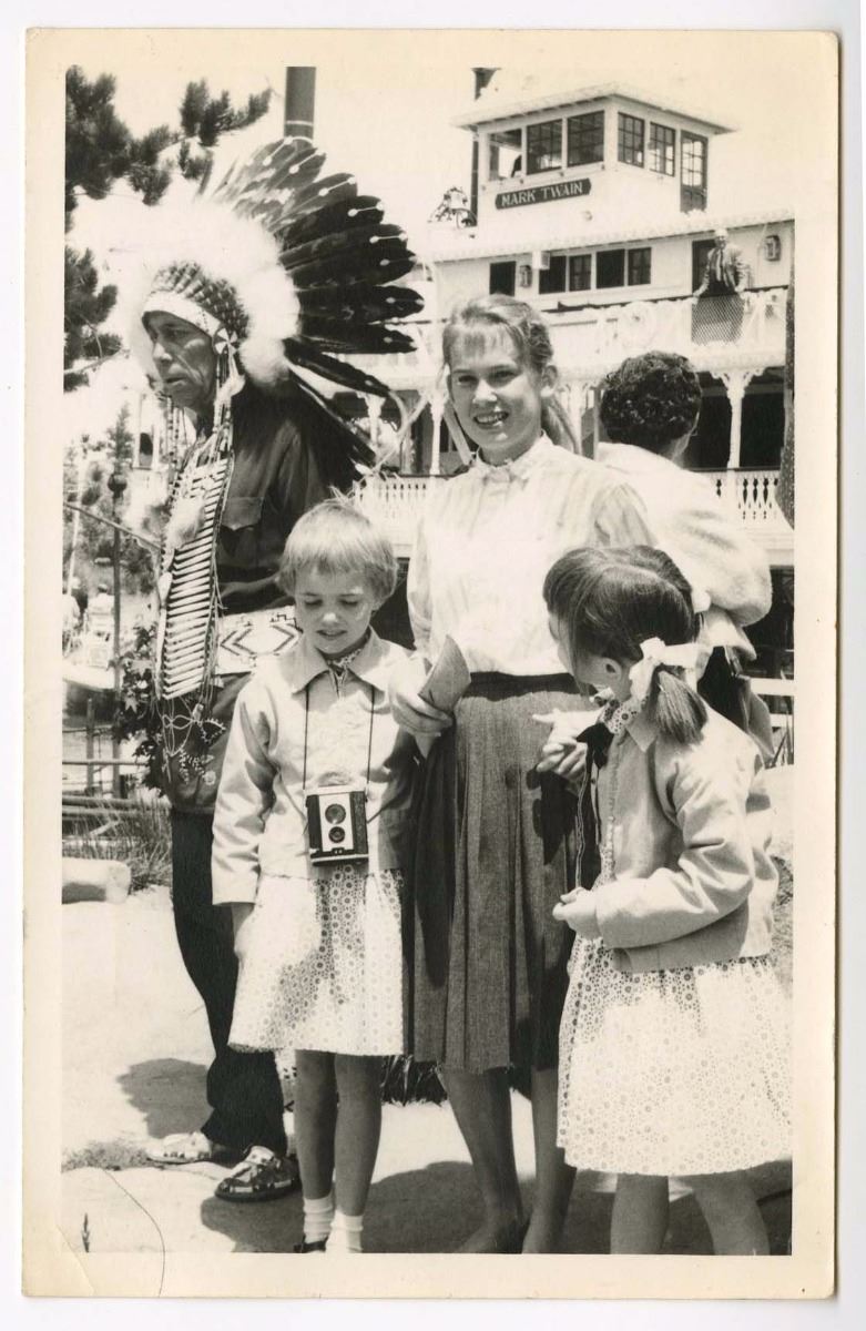 (Disneyland, 1959) Postcard of children posing with a man in native american attire in front of the Mark Twain at Disneyland. Measures 3.5"x5.5". In good condition, filled out and mailed.