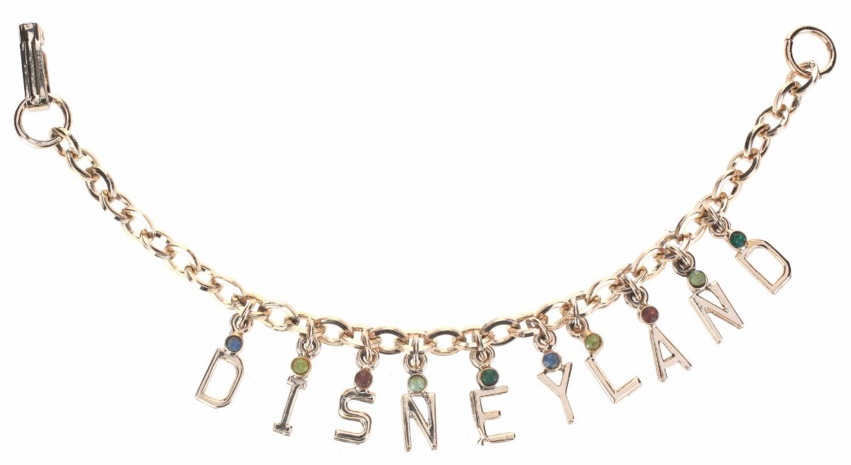 (Disneyland, 1950s) Disneyland "Jeweled Little Miss" charm bracelet featuring (10) charms that spell out "Disneyland". Chain measures 7". In good condition. Comes attached to its original display card from Disneyland with charming park graphics on the back.