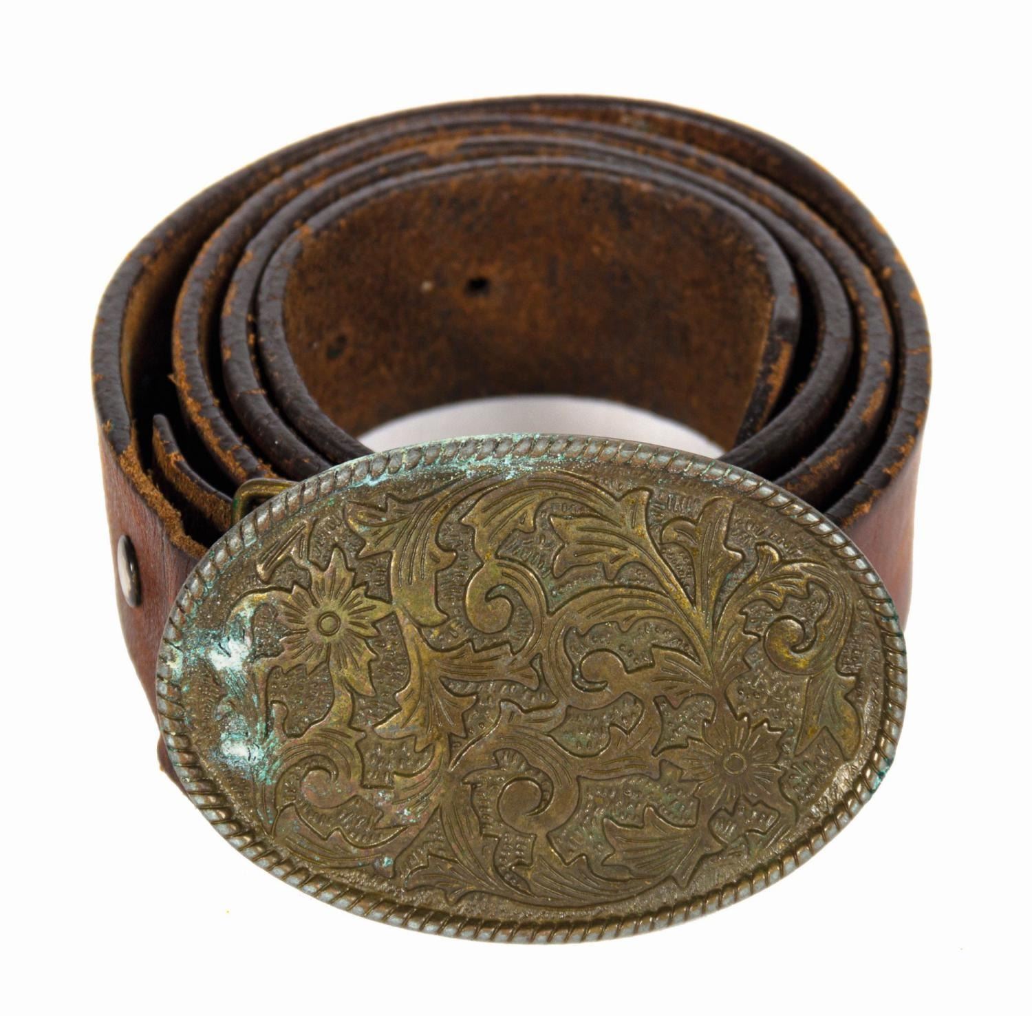 (Disneyland, c.1990s) A park-worn cast member belt from Disneyland's Jungle Cruise attraction. The brown leather belt features a cast metal buckle with a raised tropical vine and flower design. The reverse retains a park barcode label and is marked in black ink size "34." The belt and buckle are in well-worn good condition with scratching, surface impressions, stress lines, and edge wear to the belt and finish loss and patina to the buckle.