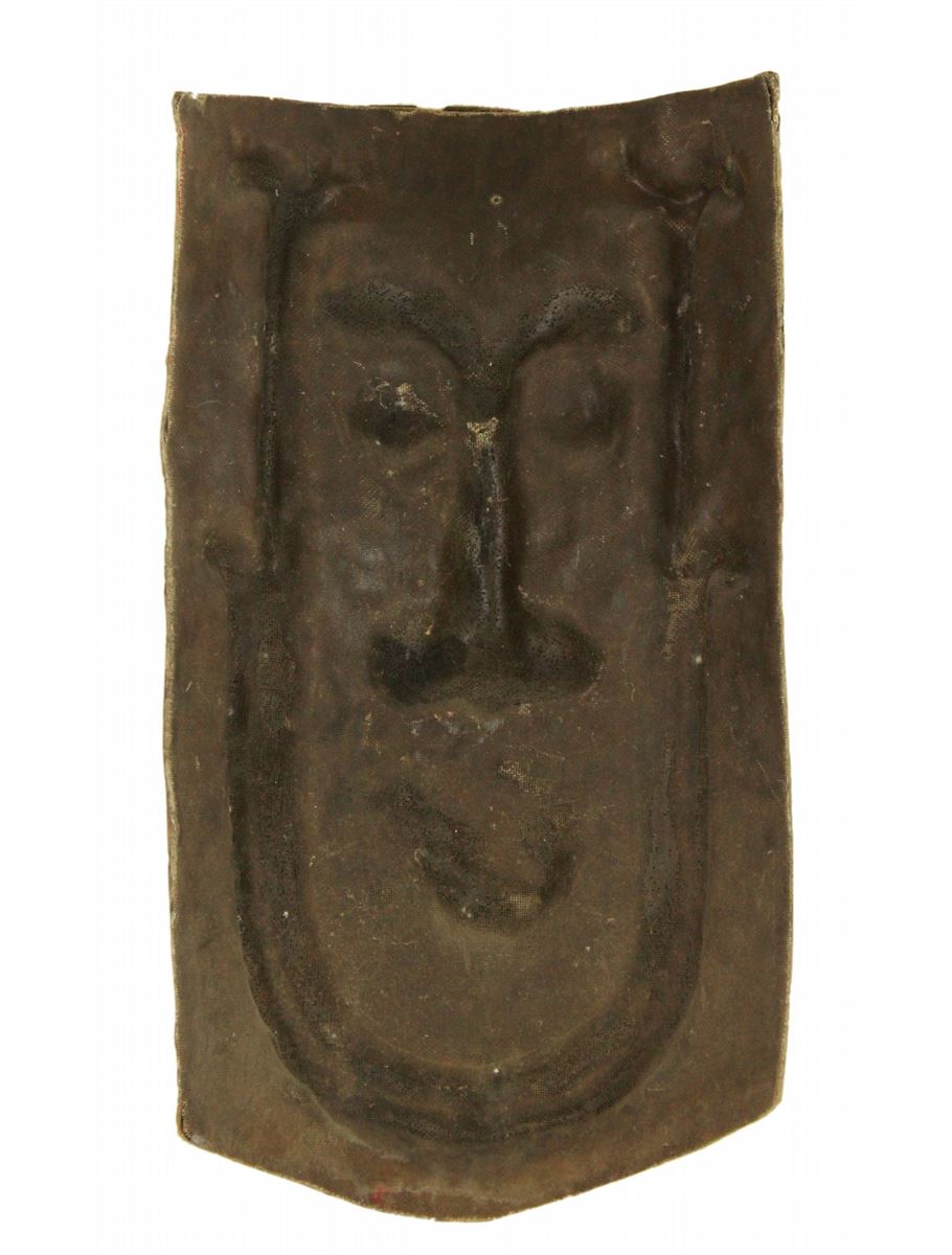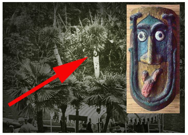 (Disneyland, 1956) A very rare and unusual prop from the early days of the Jungle Cruise Attraction, this fiberglass “Native Tree Mask” was one of three that adorned the trees near the loading area for the first few years of the ride, or until the young trees outgrew them. Hand painted and loosely based on an authentic example, the mask measures 29 x 14.5 in. In good condition with expected wear and patina from use.