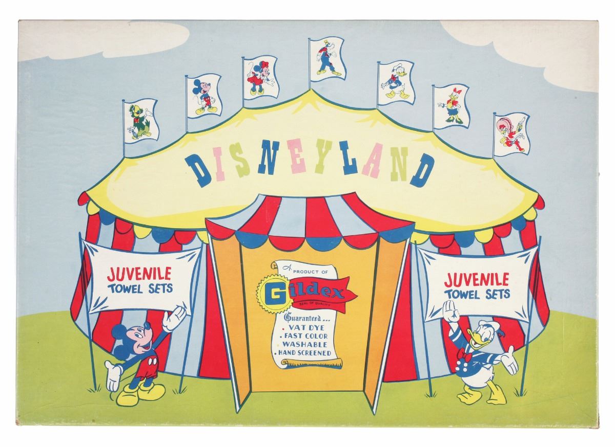 (Disneyland, 1950s) Two-piece towel set by Gildex featuring imagery of Donald and his nephews. Comes in its original box, unopened with original plastic wrapping. Side of box lid is incorrectly stamped "Peter Pan Pattern". Box measures 17.5"x12.25" and 1" tall. In good condition with some wear to the box.