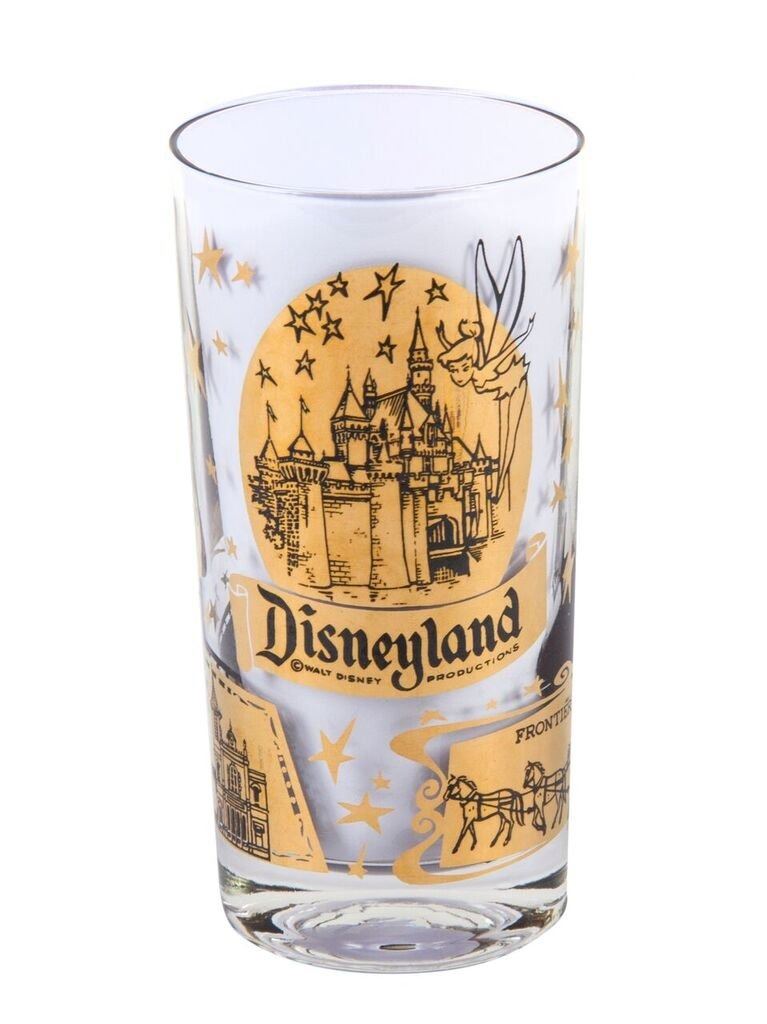 (Disneyland, c.1960) An early drinking glass featuring the 5 lands of the park in beautiful gold and black with a large main image of Sleeping Beauty Castle. This item measures 2.75" in diameter and 5.5" tall and is in very good condition with little wear.
