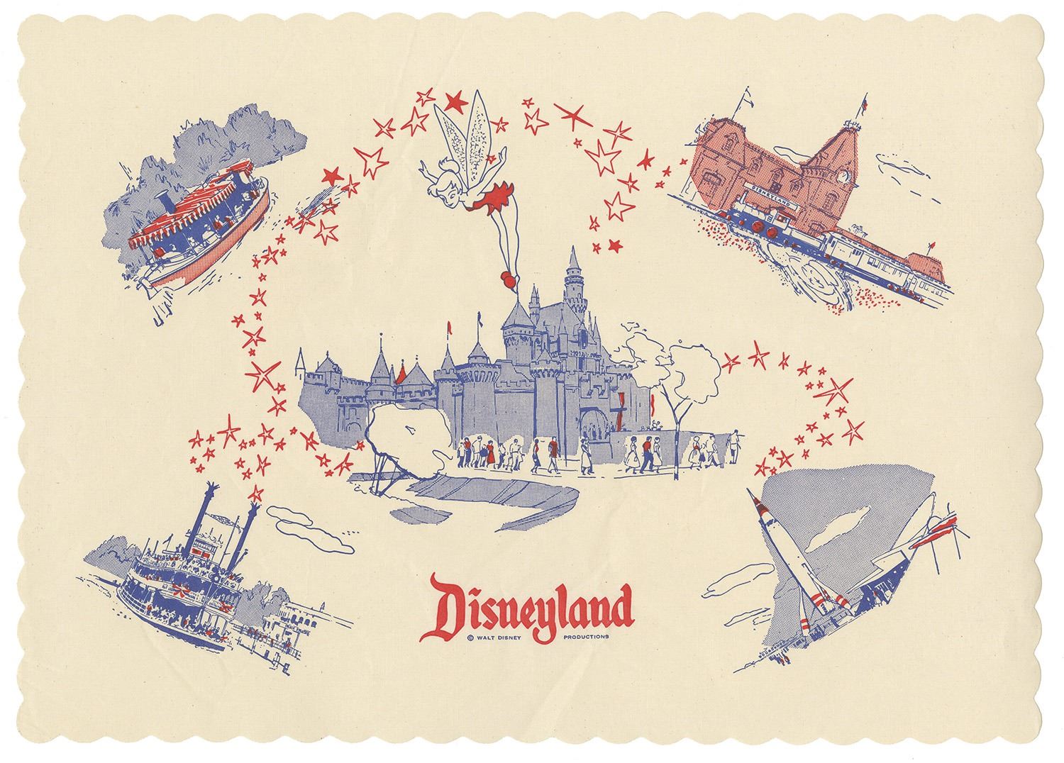 (Disneyland, 1950s) An early Disneyland paper placemat featuring iconic landmarks of the park's five original lands. Measuring 10"x14" the placemat is in very good condition with minor creasing throughout.
