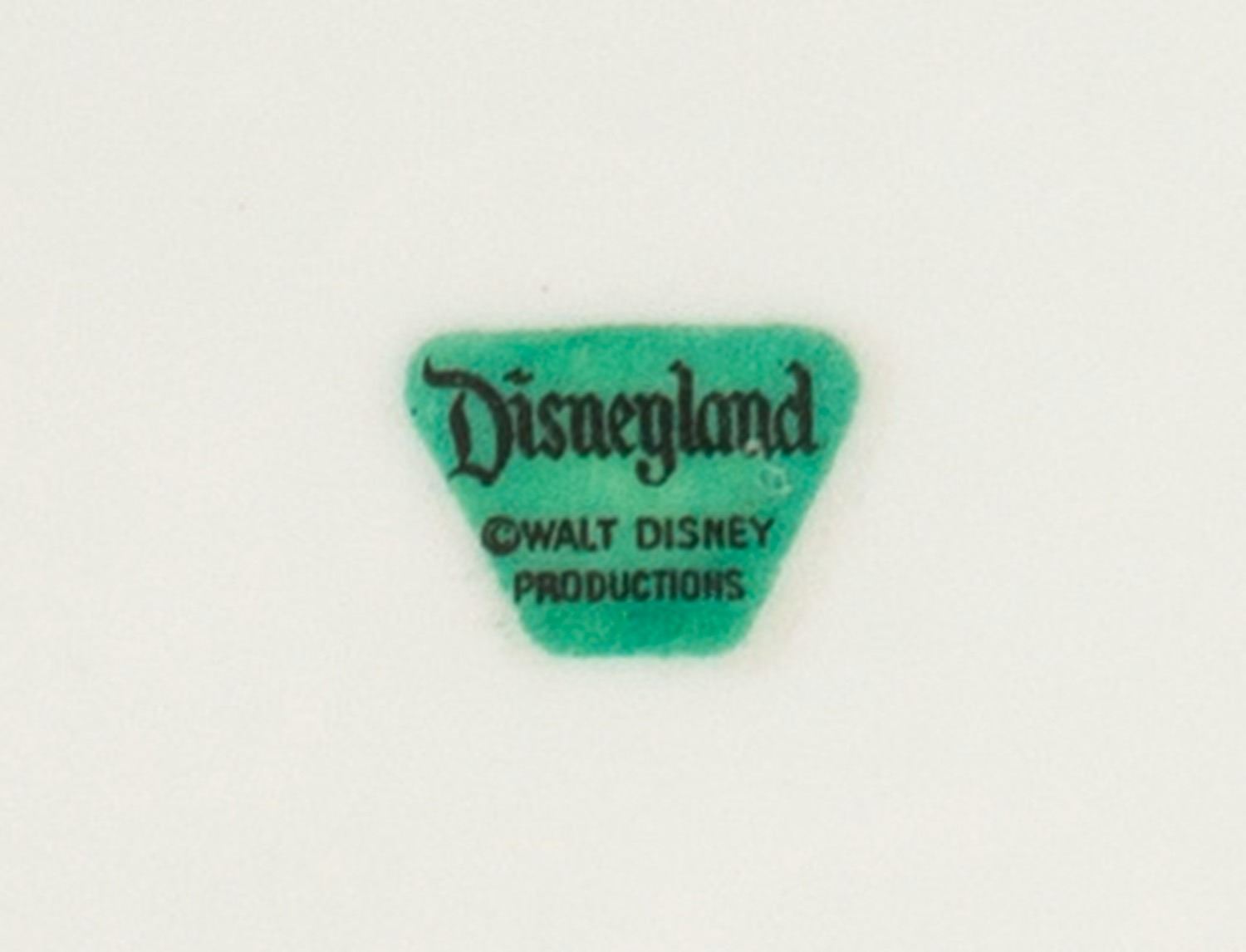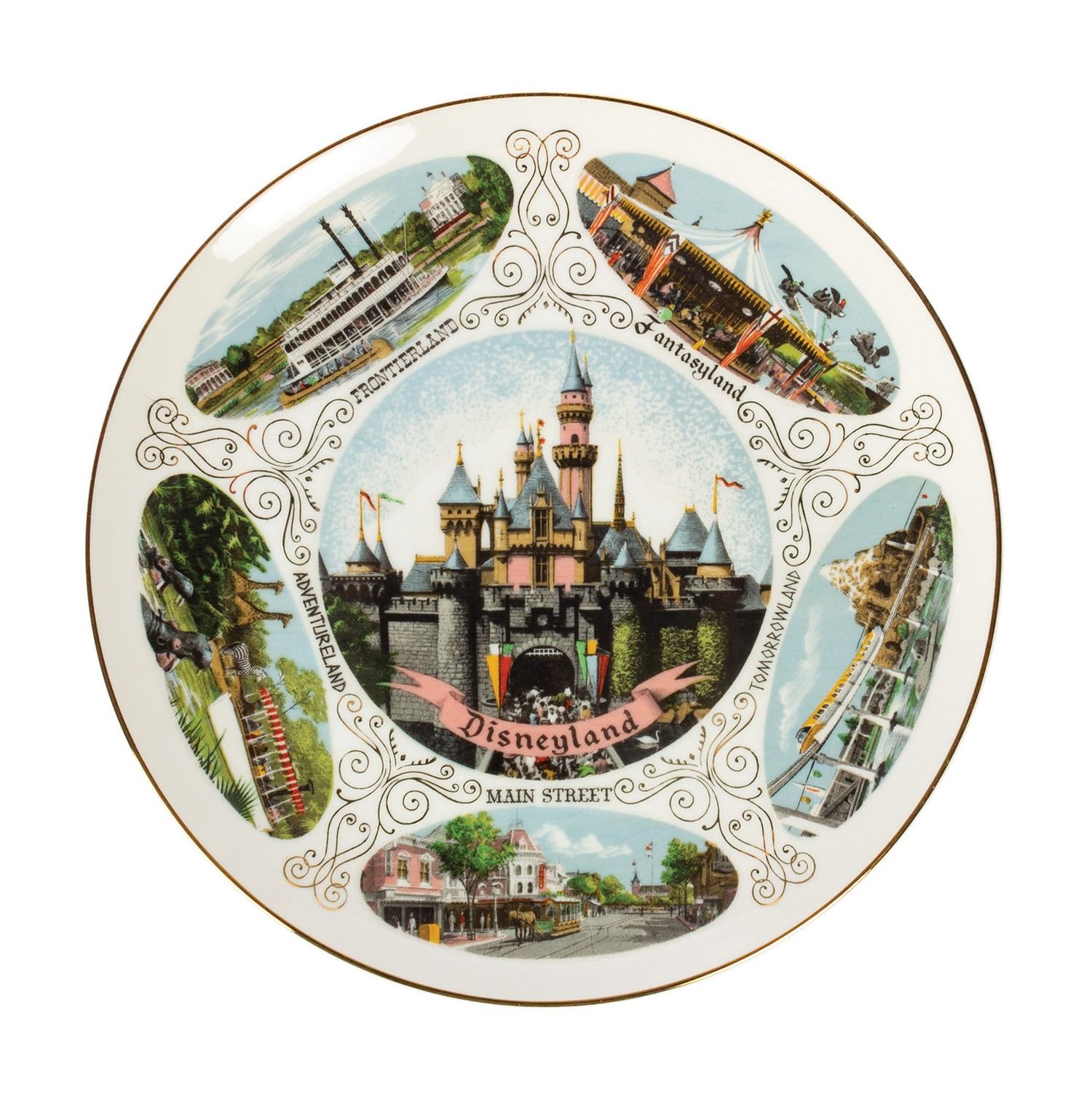 (Disneyland, c.1961) A colorful plate depicting Disneyland's (5) original lands with a large center image of Sleeping Beauty Castle. The Tomorrowland section of the plate includes rare promotional imagery of the yellow Monorail train which debuted in 1961. Measuring 9.5" in diameter, the plate is in very fine condition.