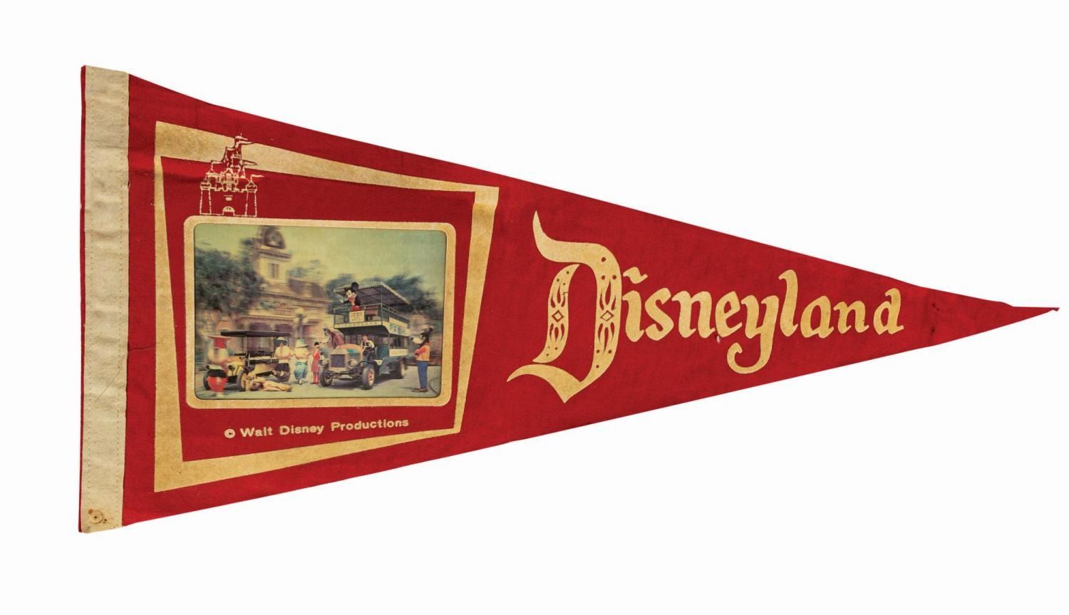 (Disneyland, c.1960) A vintage Disneyland pennant featuring a photographic lenticular depicting Disney walkaround characters and a double-decker bus on Main Street. The lenticular, which is adhered to the reverse, is framed by an excised window in the felt. Measuring 11"x28.5", the pennant is in good condition with some browning from age, color softening, creasing, spot surface wear, and corner tack holes with oxidation stains.