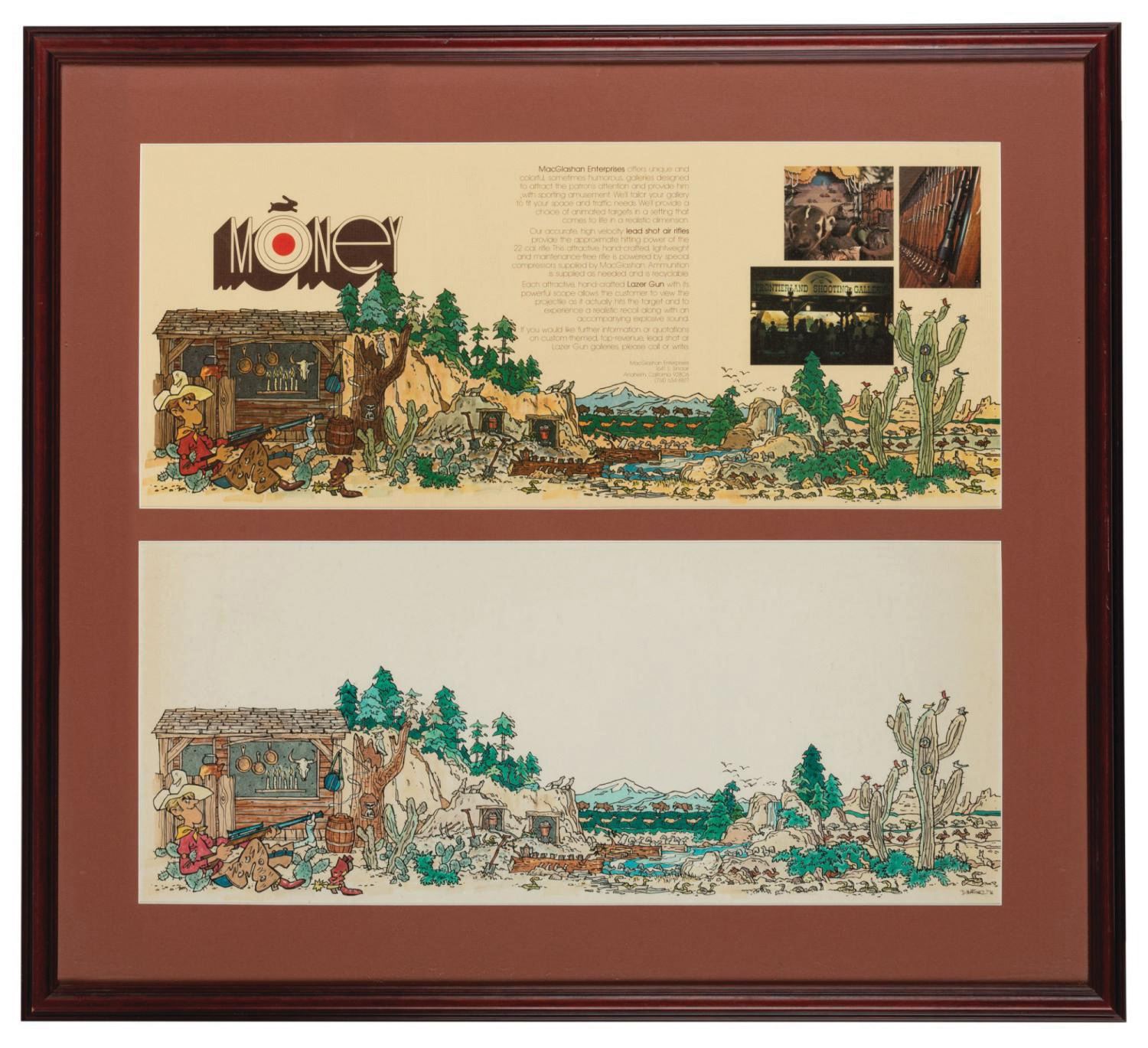 (Disneyland, 1976) A framed piece of original art produced for the cover of a MacGlashan Enterprises brochure featuring the Frontierland Shooting Gallery at Disneyland. The brochure cover was created by Dan Martinez (Disney News Magazine illustrator) and features three vintage 1970s images of the Frontierland Shooting Gallery including the .22 caliber rifle storage. Measuring 32.25"x28.75" the unique piece of Disneyland history is in very good condition with slight wear to the wooden frame and rear dust cover from previous display.
