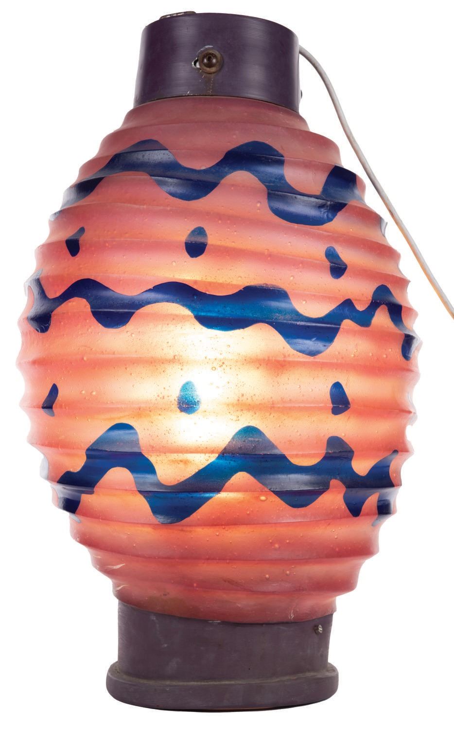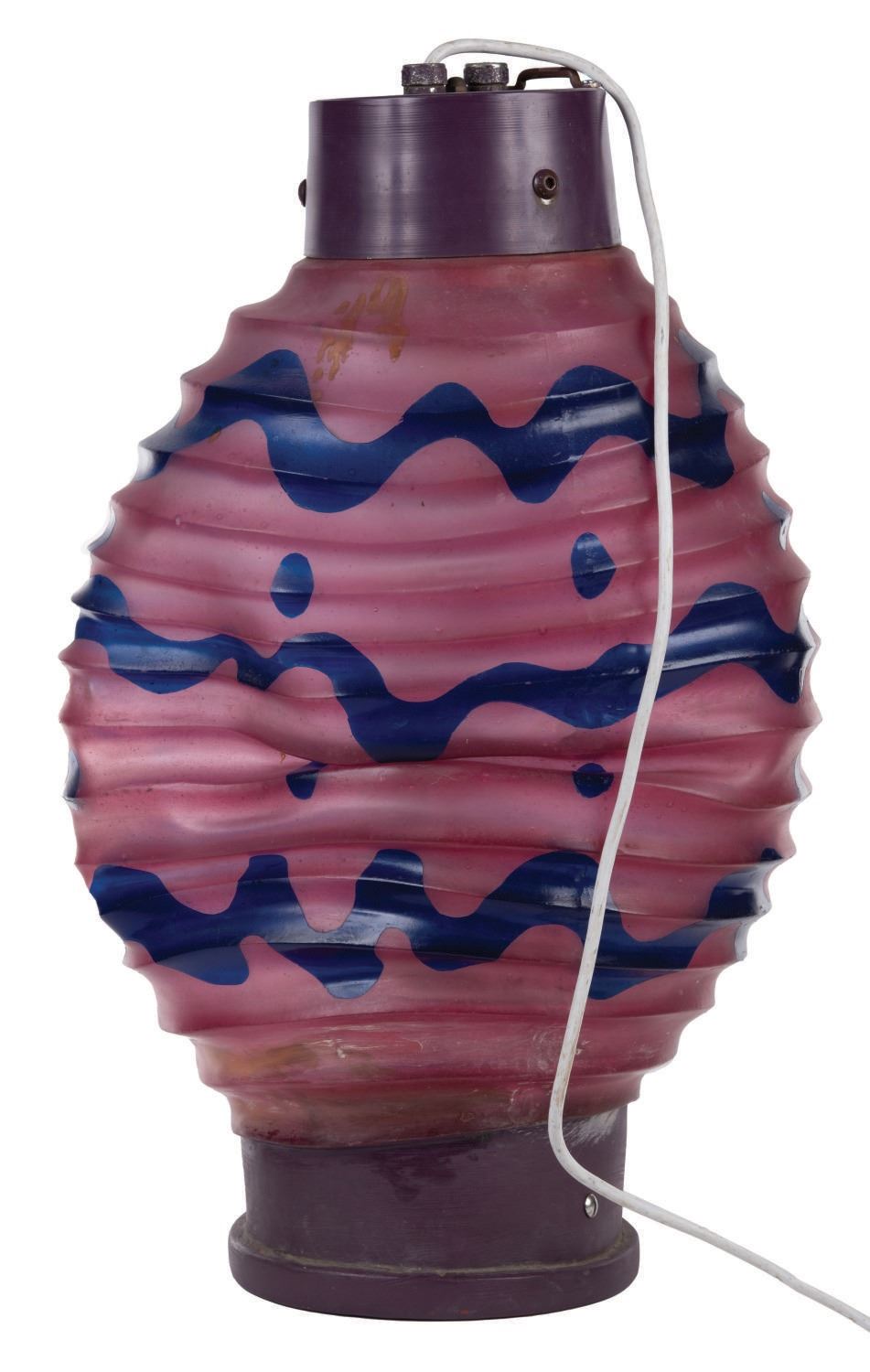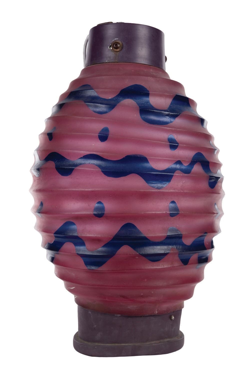 (Disneyland, 1980s-1990s) A hanging lantern decoration from the Mad Tea Party attraction at Disneyland. Constructed of metal and hard translucent plastic, it's designed to give the appearance of a paper party lantern. The lantern glows with a gentle purple light when plugged in. Measuring 30" high with a 17" diameter, the lantern is in overall good condition with a warp in the plastic on one side.