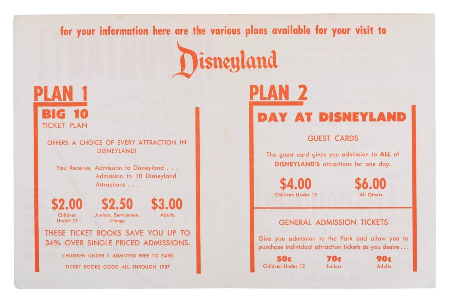 (Disneyland, 1957) A ticket information brochure from Disneyland, promoting ticket books, guest cards, and general admission tickets. Measuring 5.5" x 8.5" open, the brochure is in good condition with typical light wear.