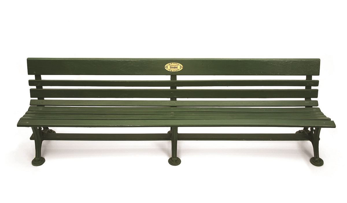 (Disneyland, 1955) From the collection of Kevin Doherty comes this incredible Disneyland park bench. Occupying a space in town square on main street for 44 years, this wood and cast iron bench has been lovingly restored and painted its original color. Doherty added a commemorative plaque and moved the metal property tag on the bottom of the bench to the back to make it more visible. Measuring 8' long and 32" high. In very good condition with some wear from use. Special shipping arrangements apply.