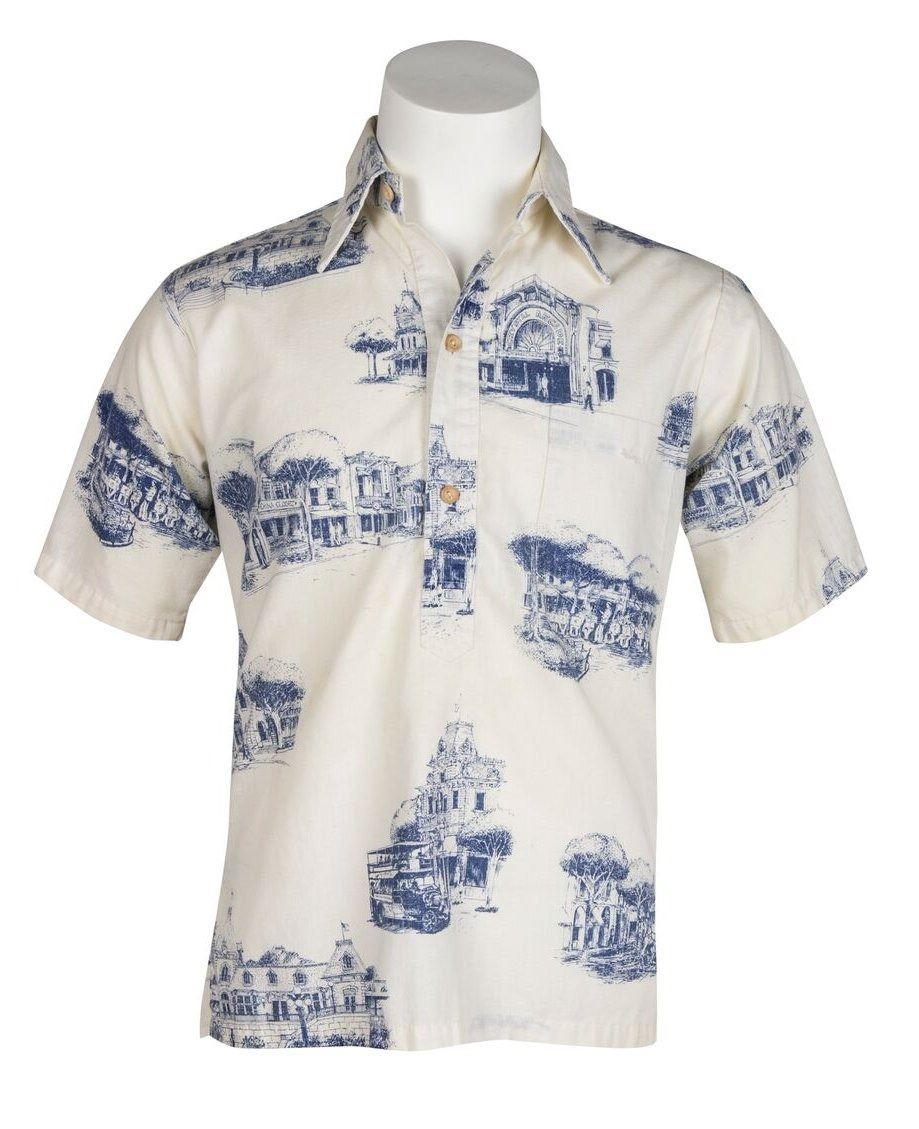 (Disneyland, 1990s) A souvenir Disneyland shirt featuring imagery of the various Main Street buildings throughout. This shirt still retains its original Disneyland tag on the inside of the collar. This item is a men's size medium, and is in good condition with minor wear including a missing button on the front pocket and some discoloration along the collar and sleeves from use.