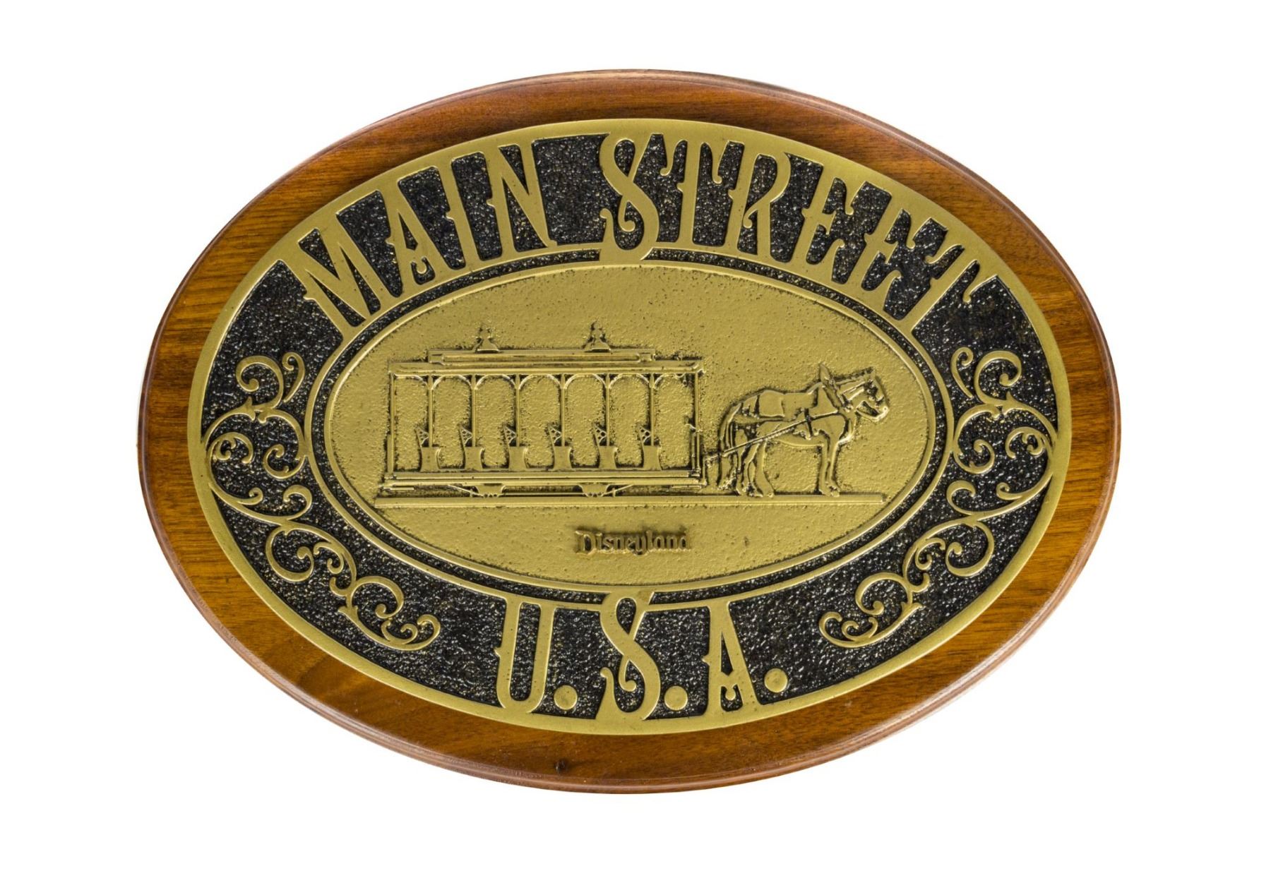 (Disneyland, c.2000s) A beautiful replica plaque that faithfully recreates the similar plaques seen on the trash can of Main Street. Reading "Main Street U.S.A.", this resin plaque depicts on of the horse-drawn trolleys with decorative border imagery. The plaque has a wooden backing, which measures 14"x10". The condition is very good with little wear.
