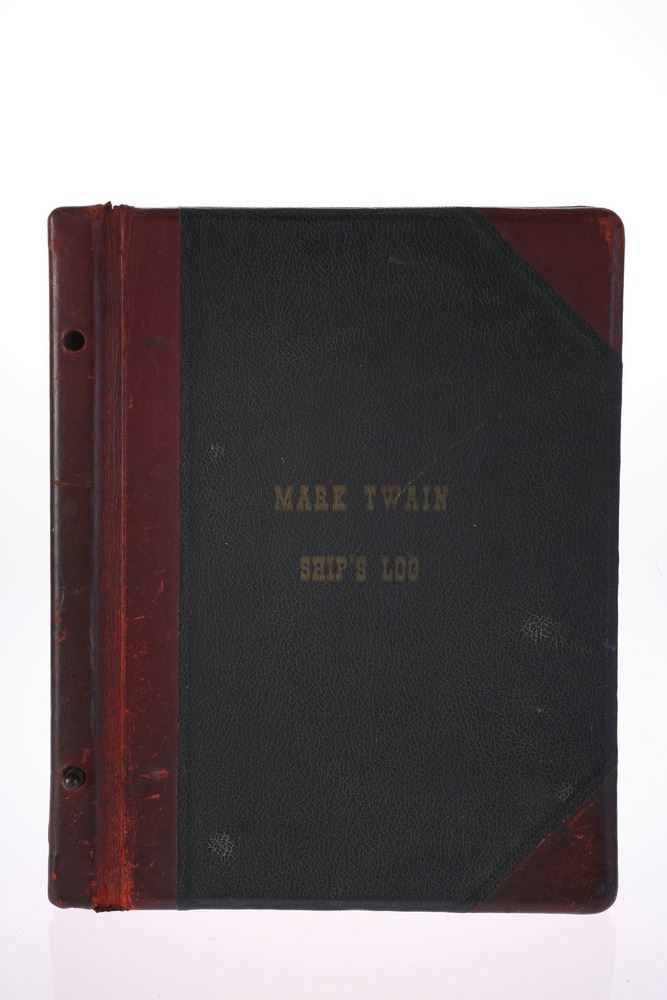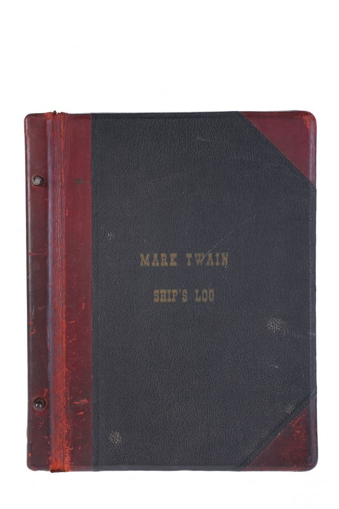 (Disneyland, 1960s) Rare original leather ship's log from the Disneyland "Mark Twain" riverboat. The leather-bound front and back covers were rescued by the ship's Captain after he saw them removed and unceremoniously discarded. The logbook was replaced by a more generic "Guest Book" in the 1970s. Measures 14.5"x11.5". In very good condition with expected wear. Missing one brass binding bolt.