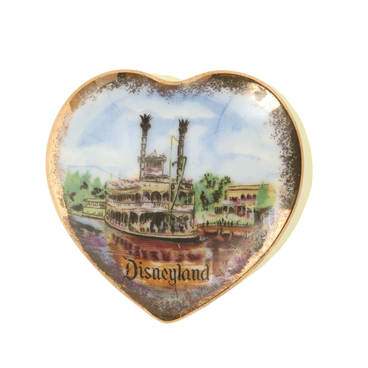 (Disneyland, 1960s) A small ceramic heart-shaped box with removable lid featuring artwork of the Mark Twain. Box reads "Mark Twain" on the underside and has the Walt Disney Productions seal. Measures 3"x3"x1.5". In very good condition with minimal wear and discoloration.