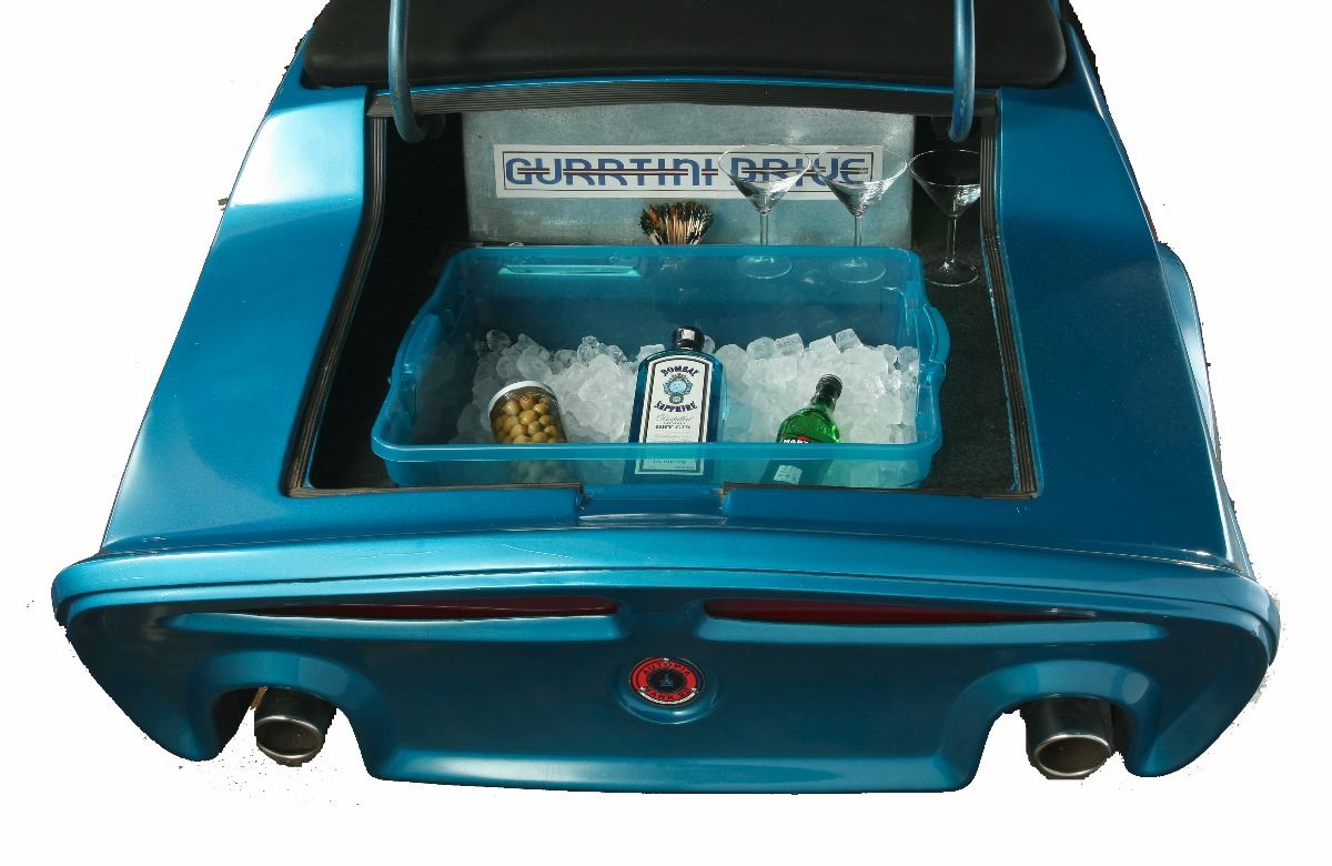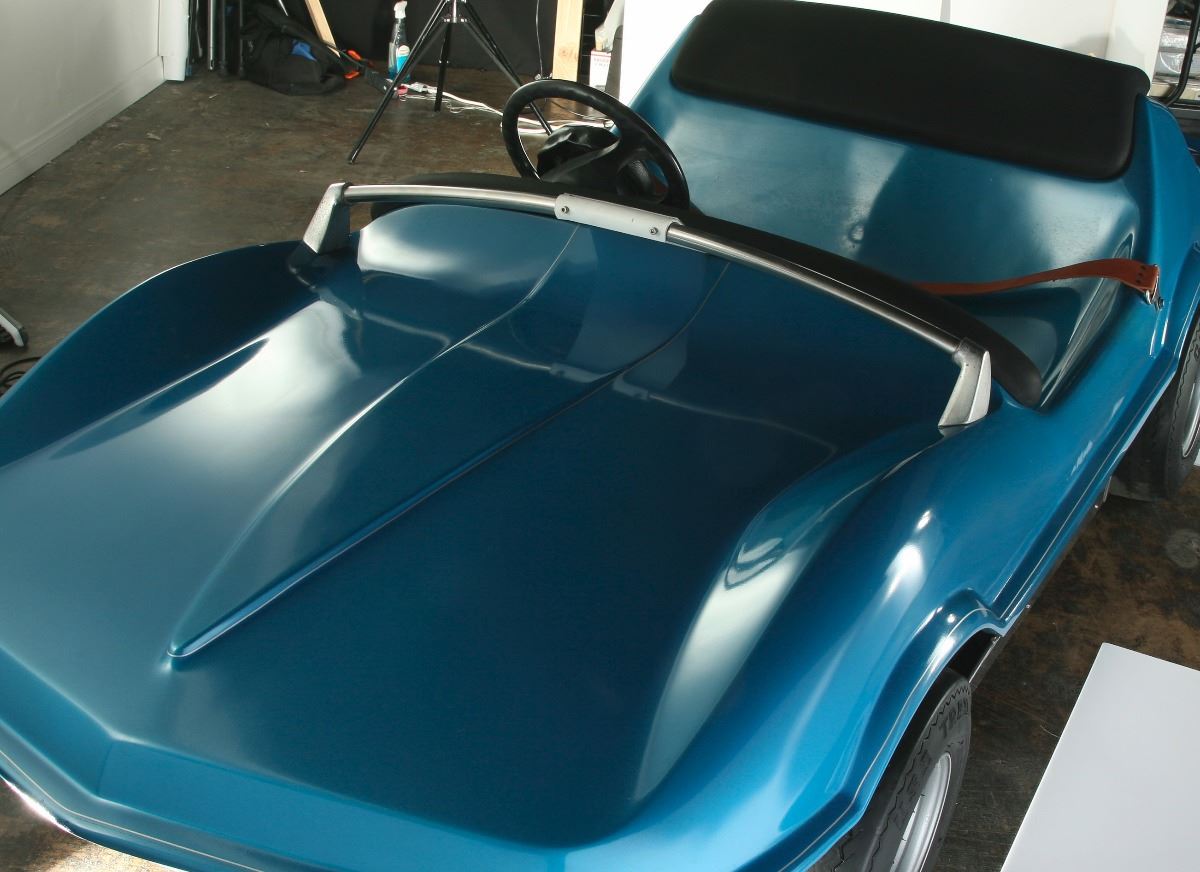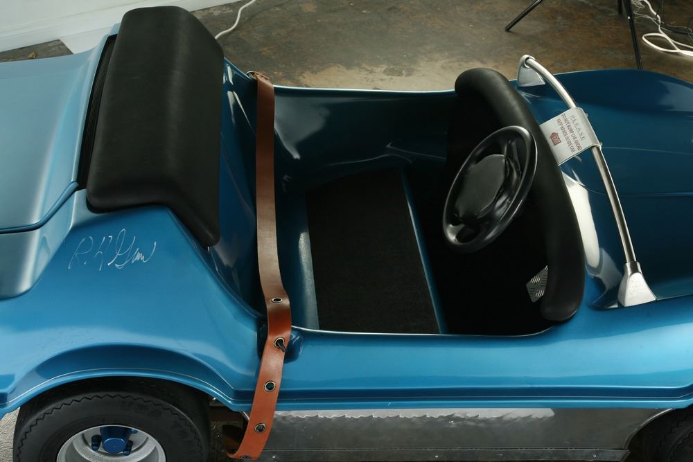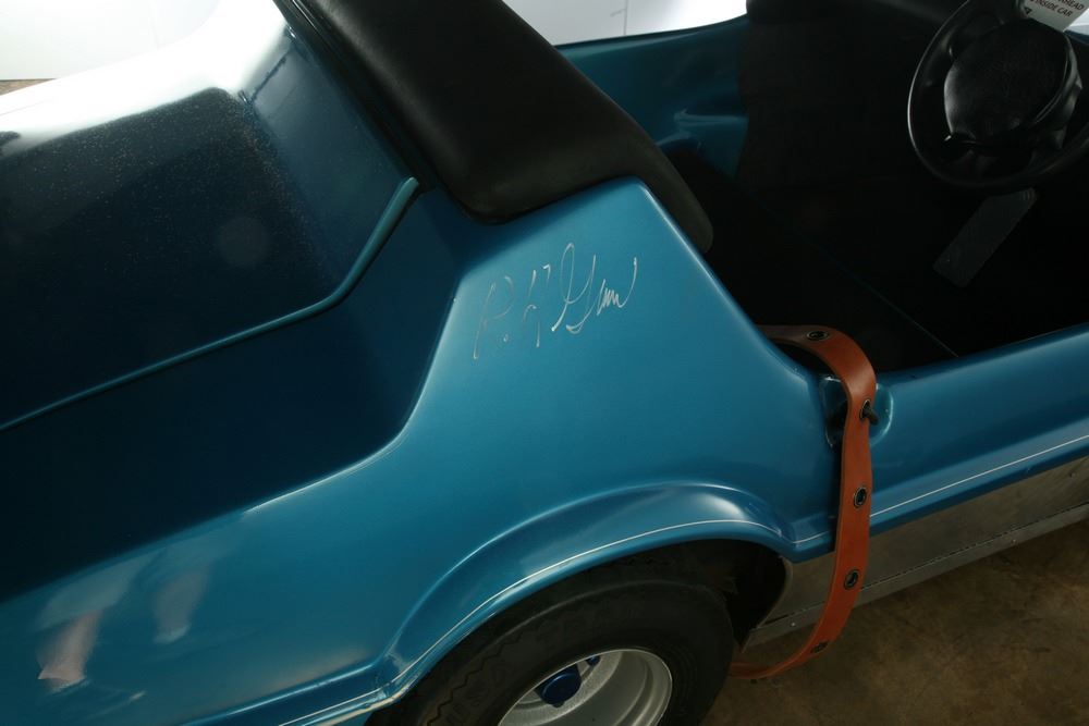 (Disneyland, 1967-1999) Beautiful Disneyland Mark VII Autopia Vehicle, custom restored by collector Kevin Doherty. The Mark VII vehicles went into service at Disneyland in 1967, and were removed from the attraction in 1999, though the original chassis are still used today. This Mark VII fiberglass body was obtained by Doherty, and custom modified for the Premier Party to celebrate Bob Gurr’s Book, “Design, Just For Fun”. Imagineer Bob Gurr is the designer of the Disneyland Autopia vehicles in addition to numerous other Disneyland ride vehicles. Placed on a custom-built chassis, this Mark VII includes working head and tail lights, and a reproduction classic leather seat belt. Doherty also converted the rear engine compartment into a "mini bar", complete with a sound system and ice chest. The vehicle was often utilized at parties attended by Bob Gurr and other Imagineers. To show his approval, the vehicle has been hand-signed by Gurr and nicknamed "The Gurrtini" after Gurr's favorite drink. The car measures 105"x45"x34" and is in very fine condition. Special shipping arrangements will apply.