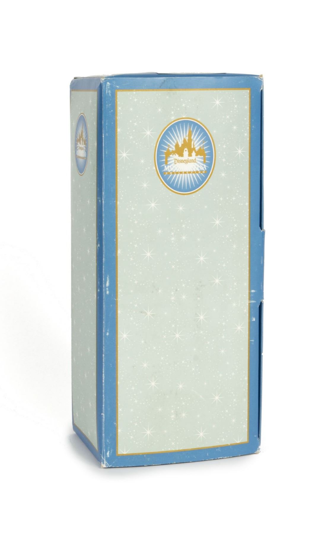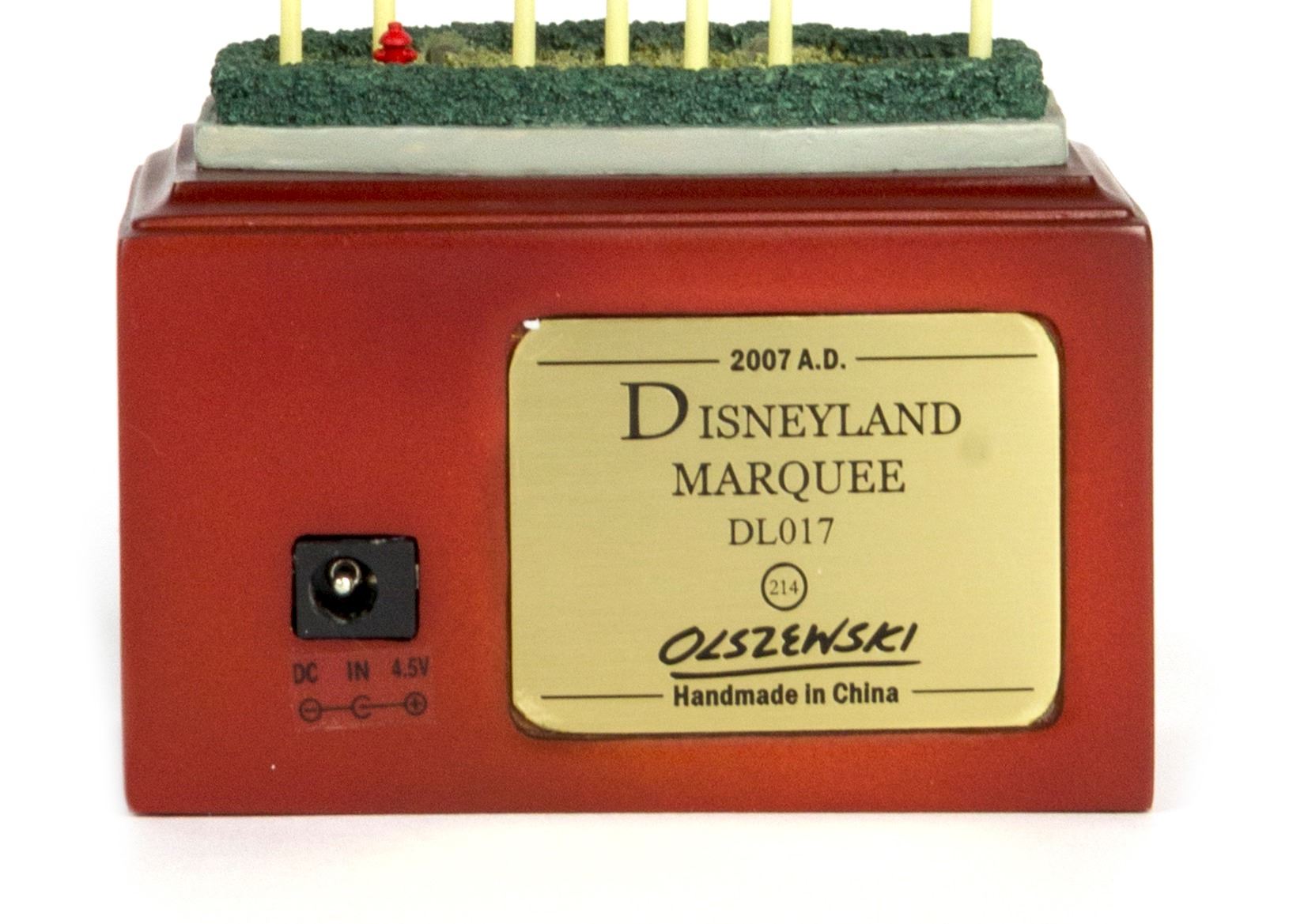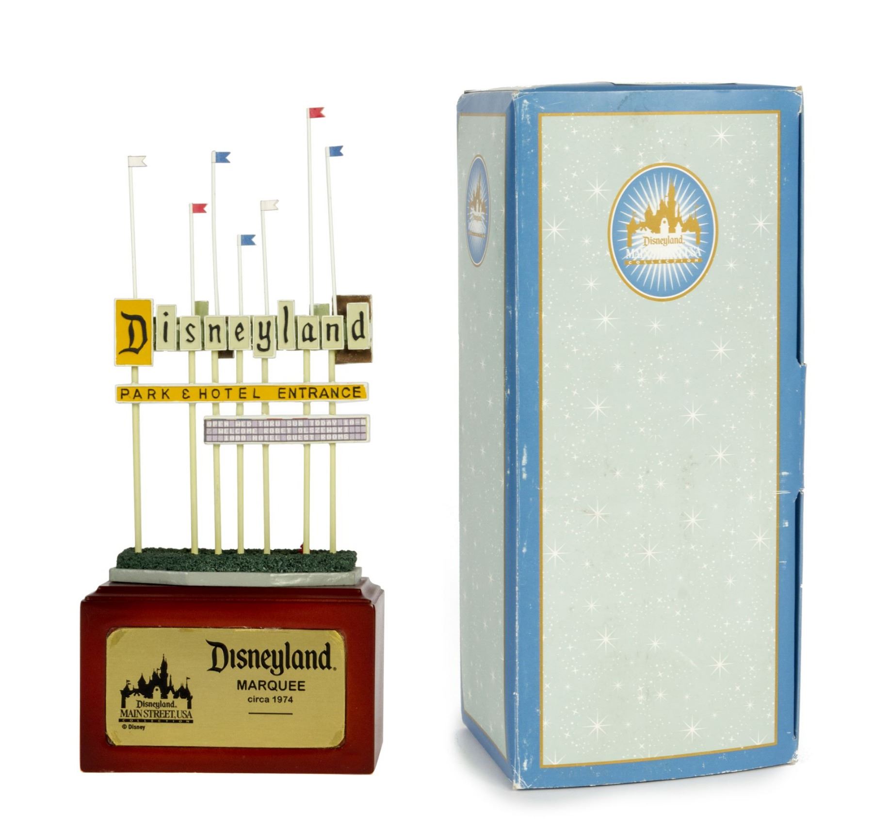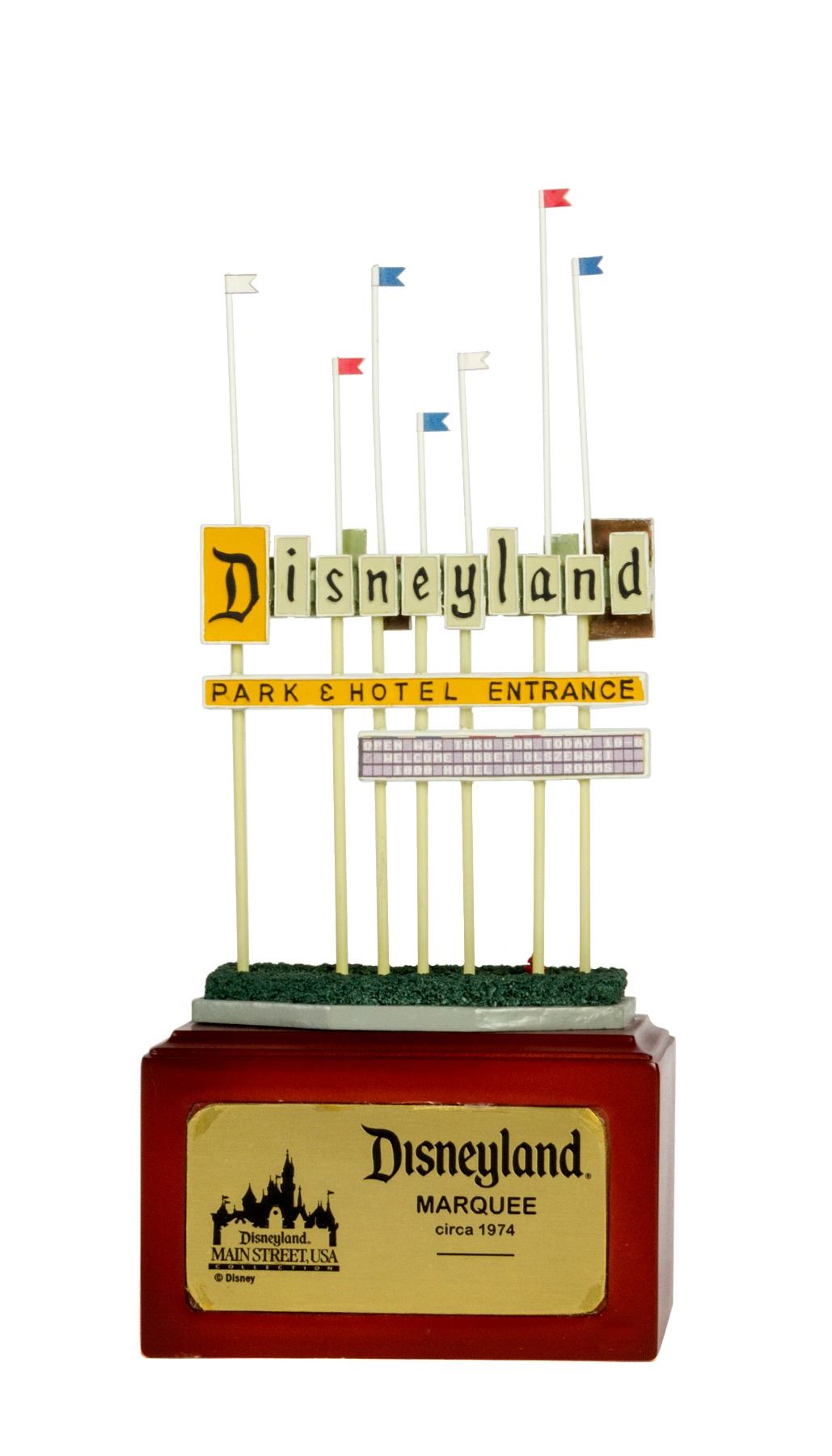 (Disneyland, 2007) A beautiful replica of Disneyland's entrance sign, as it was seen around the year 1974. This replica model, created by renowned miniaturist Robert Olszewski, features this iconic piece of Disneyland's past, with the sign reading "Disneyland Park & Hotel Entrance" with several flags displayed overhead. The model comes on a wooden base with a plaque, and with its original box. Measuring 8.5" tall, the model is in very good condition with little wear.