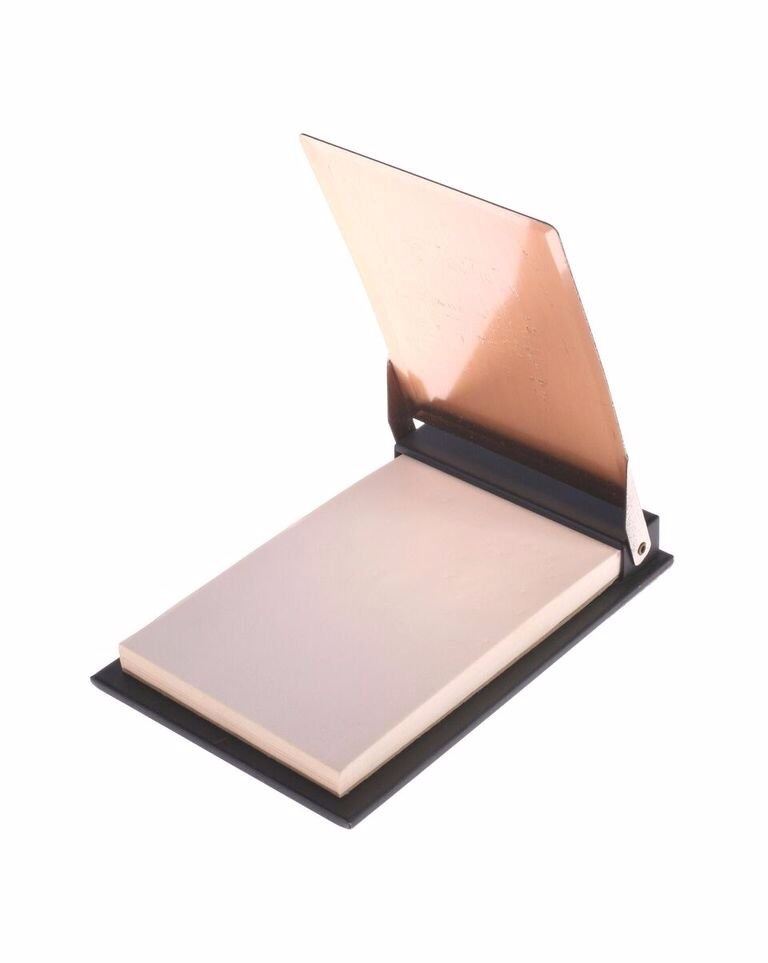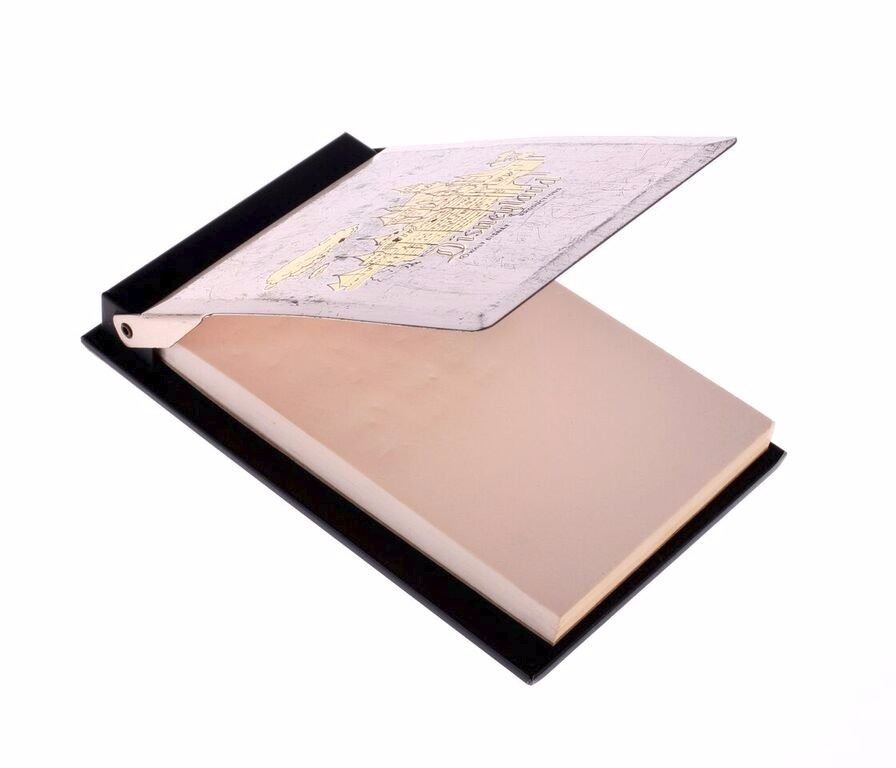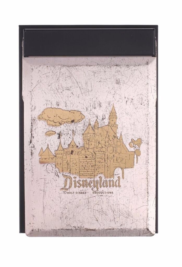 (Disneyland, c.1957) A gorgeous silver and gold-toned memo pad with imagery of Sleeping Beauty Castle. This pad is unused and comes in its original stylish teal and pink box. The box measures 5.5"x3.75" and 0.75" tall, and the item is in good condition with some wear to the box and pad cover.