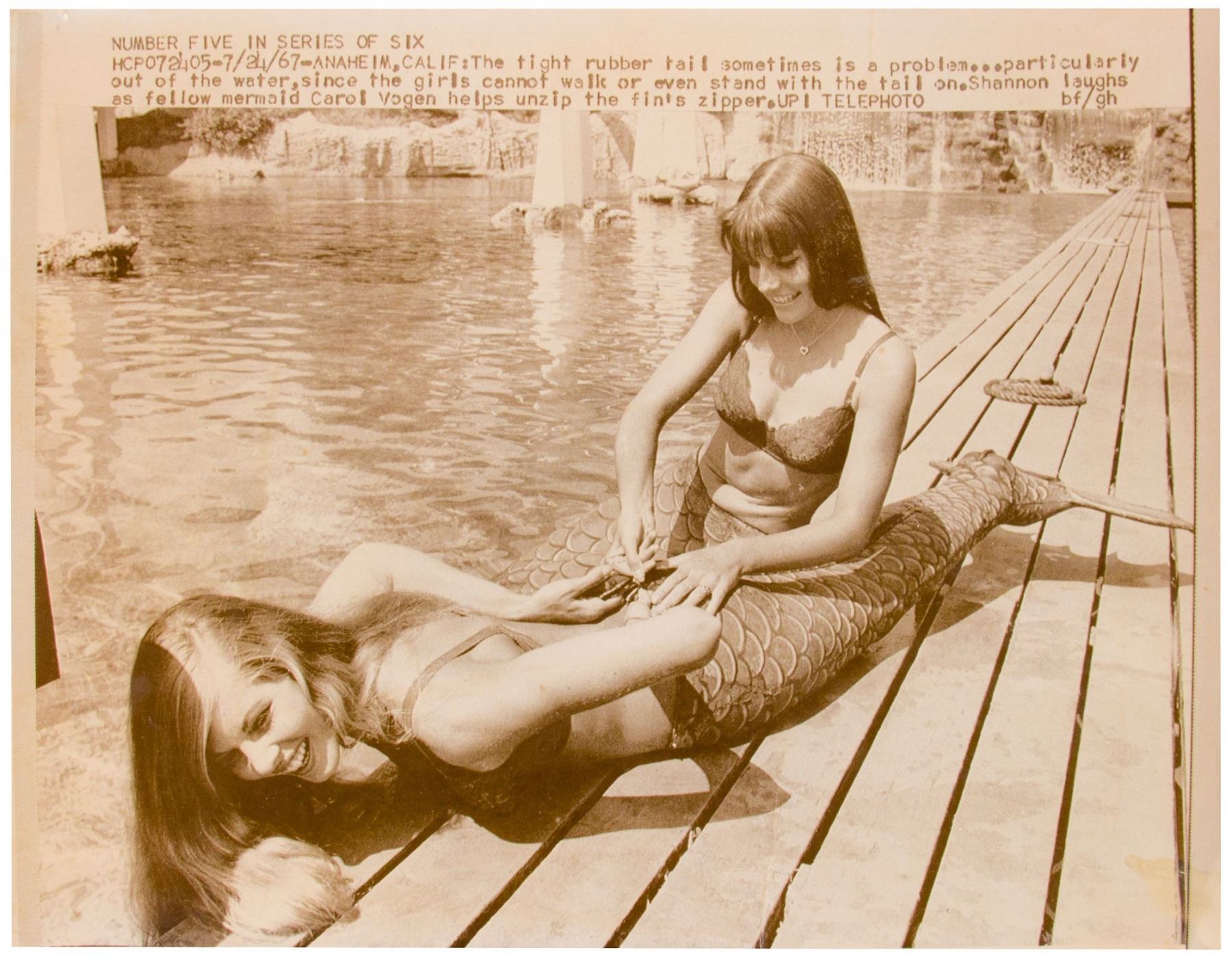 (Disneyland, 1967) A publicity photo of Disneyland's live mermaids. The mermaids were a short-lived part of the "Submarine Voyage" attraction in the mid-1960s, and guests could see them swimming and sunning themselves in the lagoon. The photo measures 8.5"x11" and is in very good condition with some creasing and edge-wear.