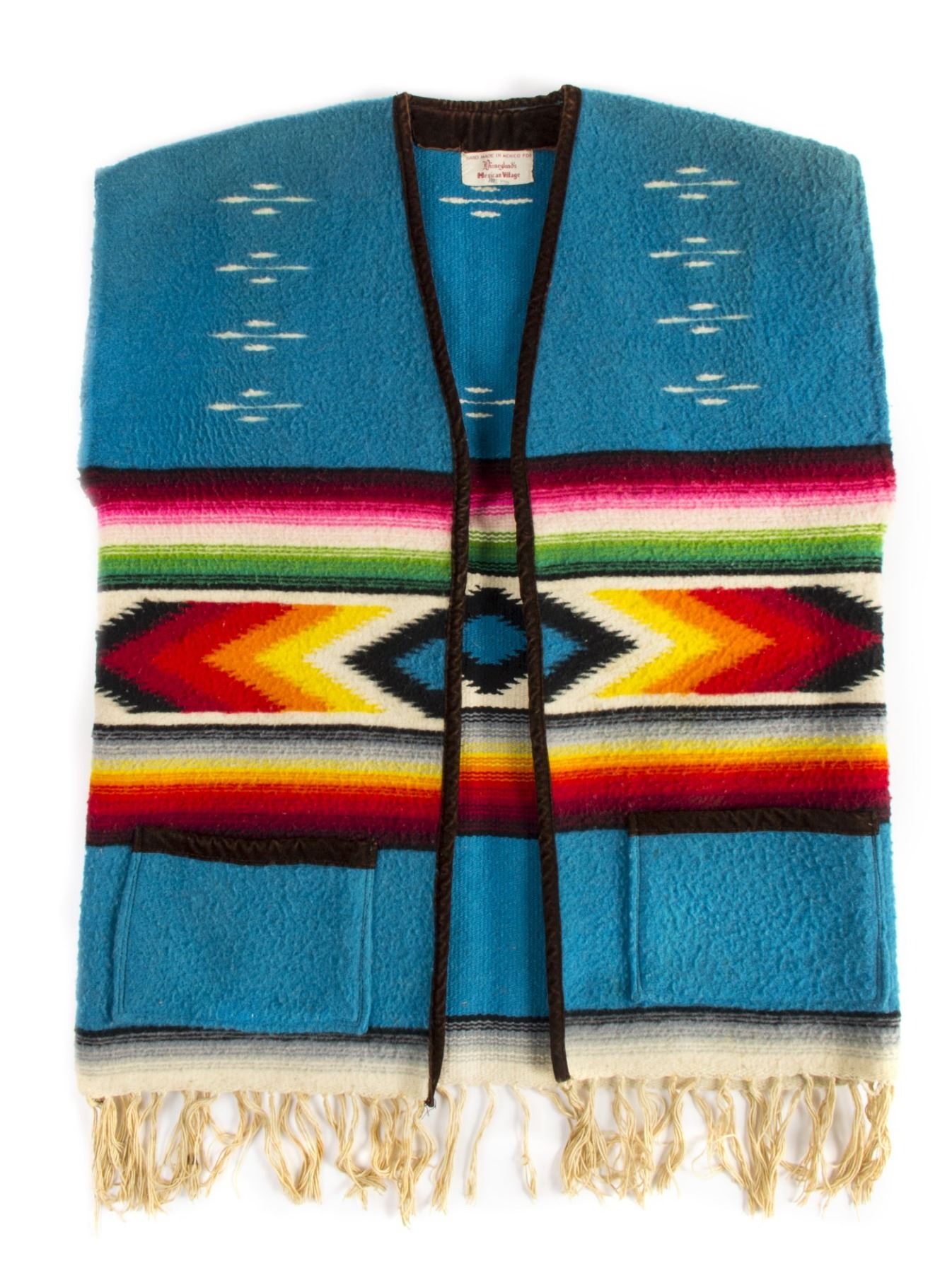 (Disneyland, c.1960) A colorful vest created in Mexico for Disneyland's "Mexican Village" in Frontierland. Hand-crafted in 100% wool, the vest has a beautiful color pattern in the middle of the blue fabric, and measures 26"x20.5". The condition is very good with little wear.