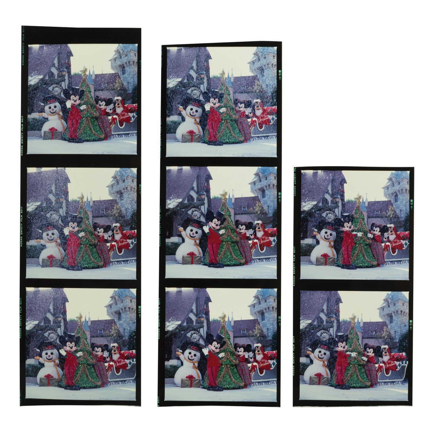 (Disneyland, 1983-87) A collection of (8) promotional holiday transparencies to promote the Mickey's Christmas Chalet Shop at Disneyland. Each image features Mickey Mouse, Minnie Mouse, Goofy, and one of the Snow People (who debuted during the winter holiday season of 1982) near Mickey's Christmas Chalet in the recently opened New Fantasyland. Measuring from 4.75" to 7.5" and 2.5" wide, the transparencies are in overall fine condition.