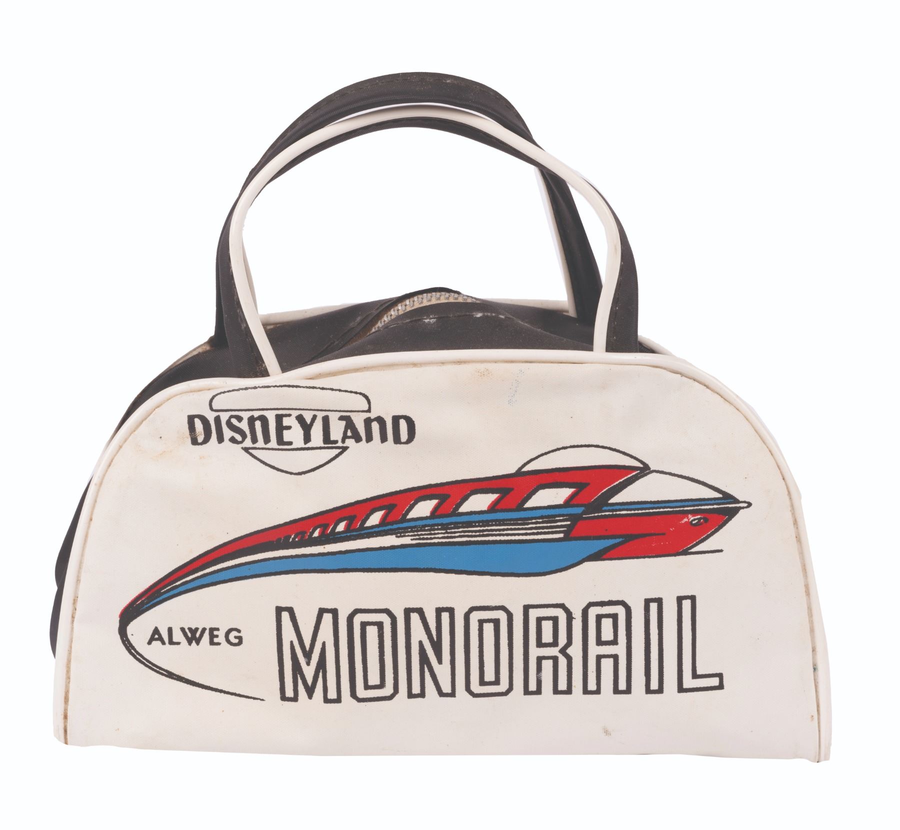 (Disneyland, 1959-60s) A souvenir black-trimmed flight bag of the Disneyland-ALWEG Monorail. The bag was manufactured by Airline exclusively for Disneyland. Measuring 4" tall and 7.5" long, the bag is in very good condition, with few signs of wear from handling and age.