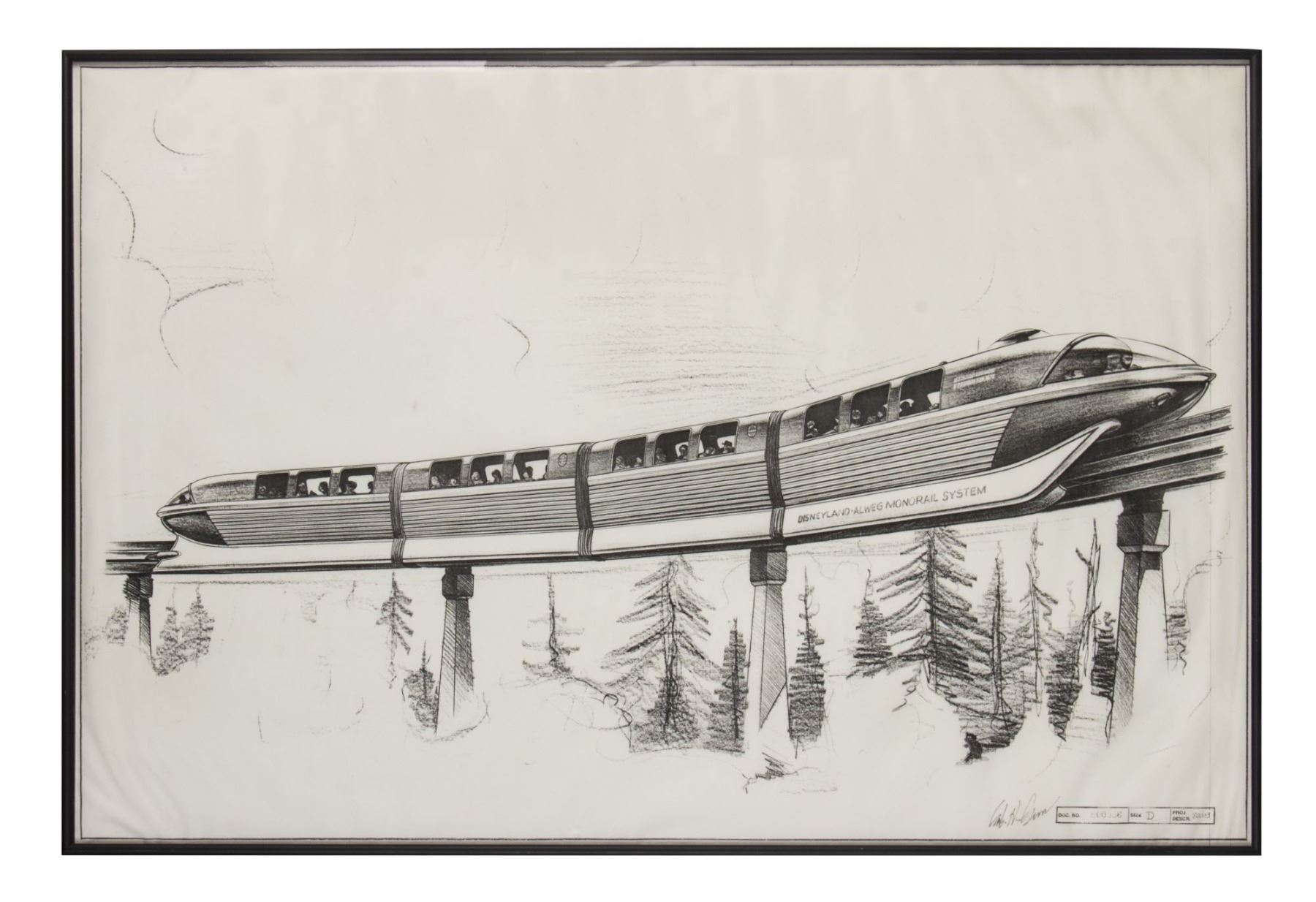 (Disneyland, c.1980s-90s) A large xeroxed copy of Bob Gurr's "Monorail" artwork that has been signed by Gurr in the bottom-right corner. This single "Monorail" image is a much harder image to find than Gurr's other designs such as the "Crossing Monorails" concept. The xeroxed print measures 23.5"x35.5" and is in good condition with some minor creasing to the paper.