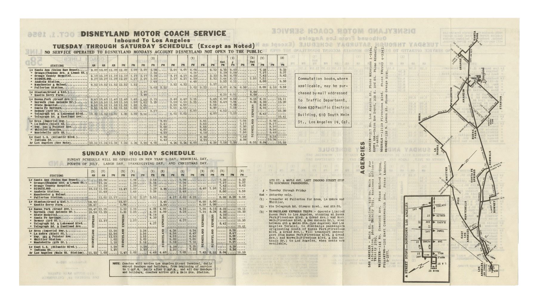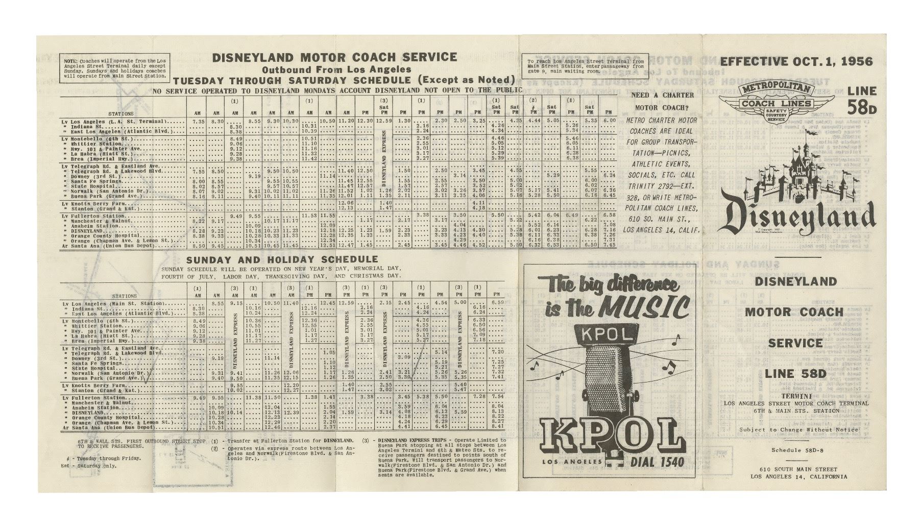 (Disneyland, 1956) A brochure for Disneyland's motor coach service Line 58D. The brochure opens to provide information on the stations and schedules, and the cover features a beautiful Sleeping Beauty Castle graphic. This early Disneyland paper item measures 7"x2.75" while folded, and is in good condition with minor wear.