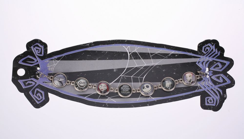 (Disneyland, 2004) Disneyland "Nightmare Before Christmas" charm bracelet featuring (7) character charms from the film. Chain measures 7.25" long. In good condition. Comes in its original packaging. Features a note on the back in ink signifying that the bracelet was purchased in New Orleans Square in 2004.