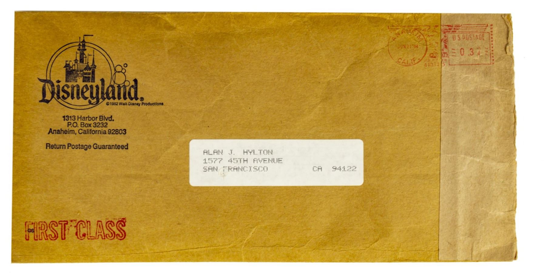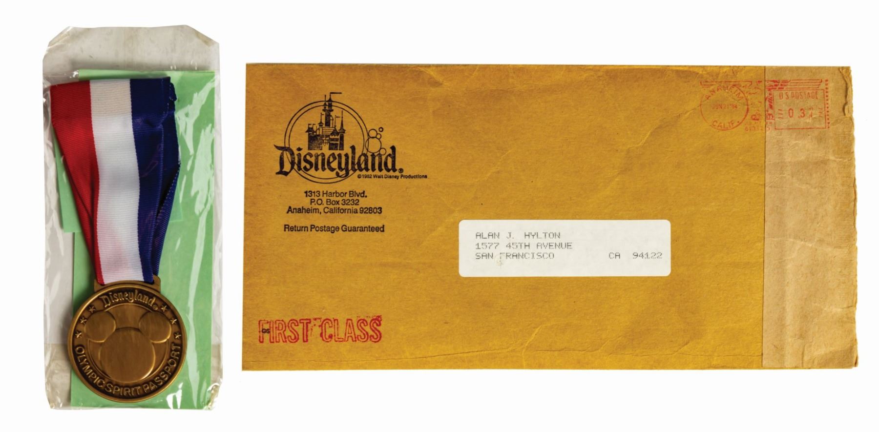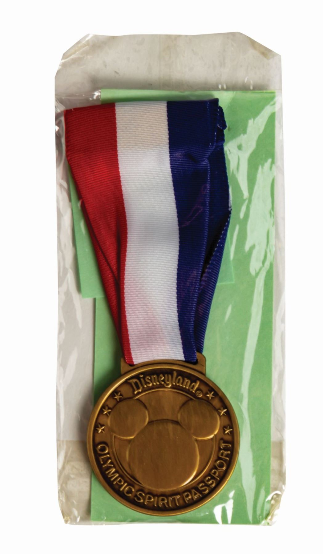 (Disneyland, 1984) A medal created in honor of the U.S. Olympic Games held in Los Angeles in 1984. The bronze-colored medal has a raised image of Mickey Mouse and reads, Olympic Spirit Passport. The medal is suspended from a red, white, and blue ribbon and comes in its original plastic wrap. The medal measures approximately 1.5" in diameter and is in very good condition. The original mailing envelope is included.