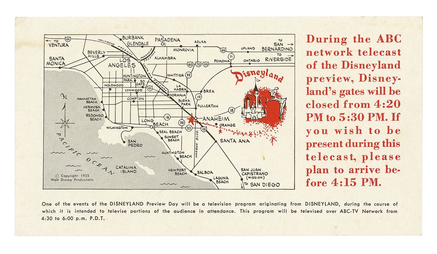 (Disneyland, 1955) A very rare silver opening day press preview ticket. As Disneyland's opening day events were being broadcast on live TV, guests and VIPs were requested to arrive at different times to accommodate the televised ceremonies. This particular pass features an entrance time of 2:30pm, and includes information on the reverse about ABC's live broadcast of the events. The ticket measures 3.5"x6.5" and is in good condition overall, with some surface scuffs, slight edge-wear, and a few faint spots of yellowing on the reverse.