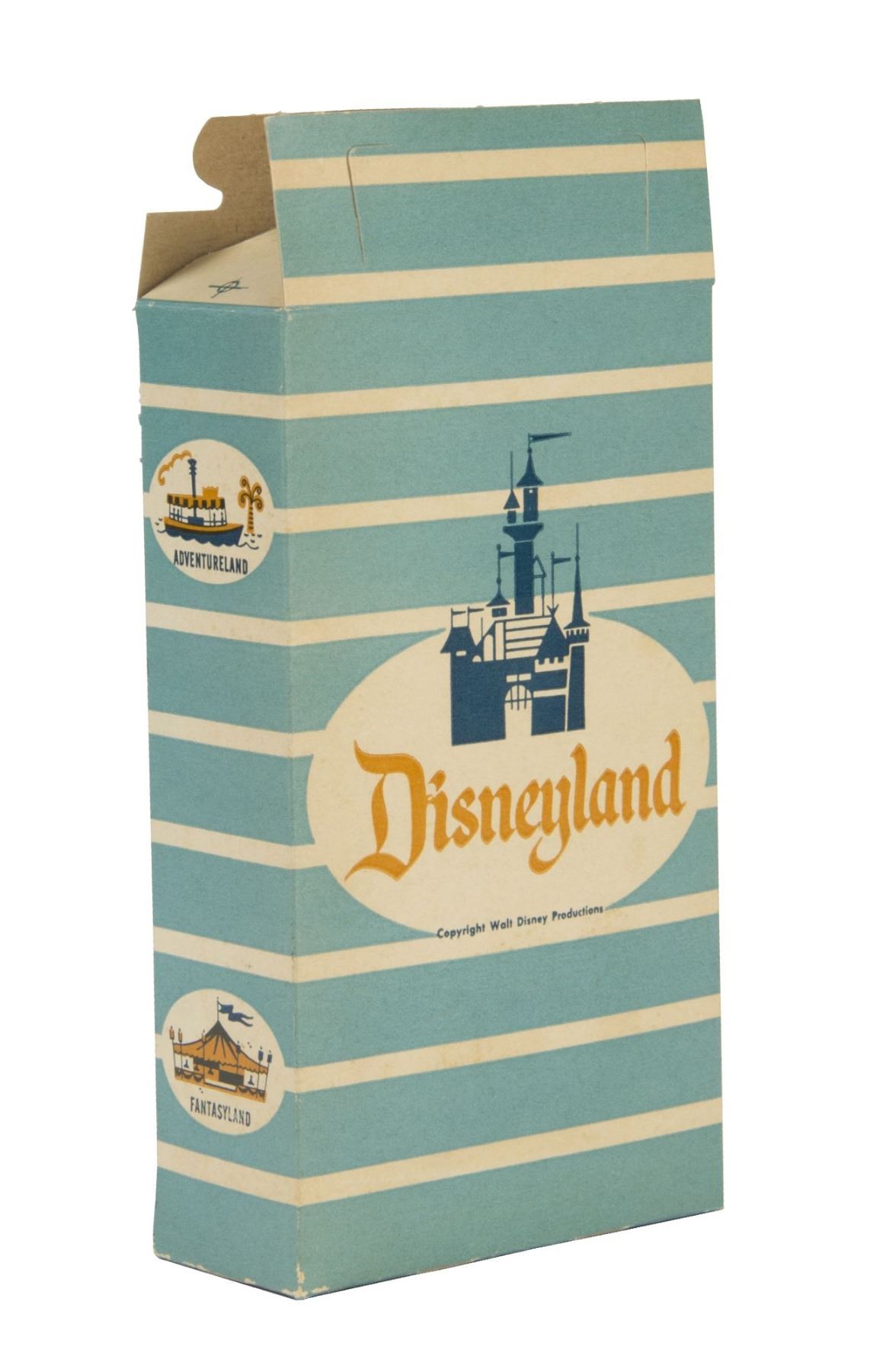 (Disneyland, c.1958) An original popcorn box from Disneyland featuring the park's castle logo on the front and back and imagery for the park's lands on the sides. These turquoise and white striped popcorn boxes are among the most sought-after of the early Disneyland paper items for how well they capture the feel of the first few years of the park. Measuring 7.25" tall, the popcorn box is in very fine condition with minor wear from use.