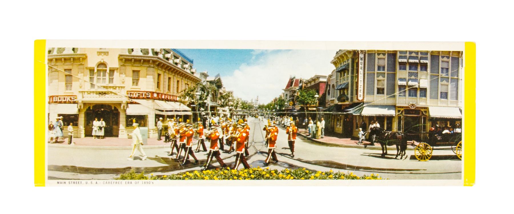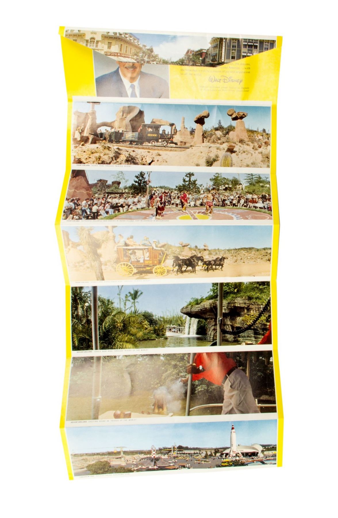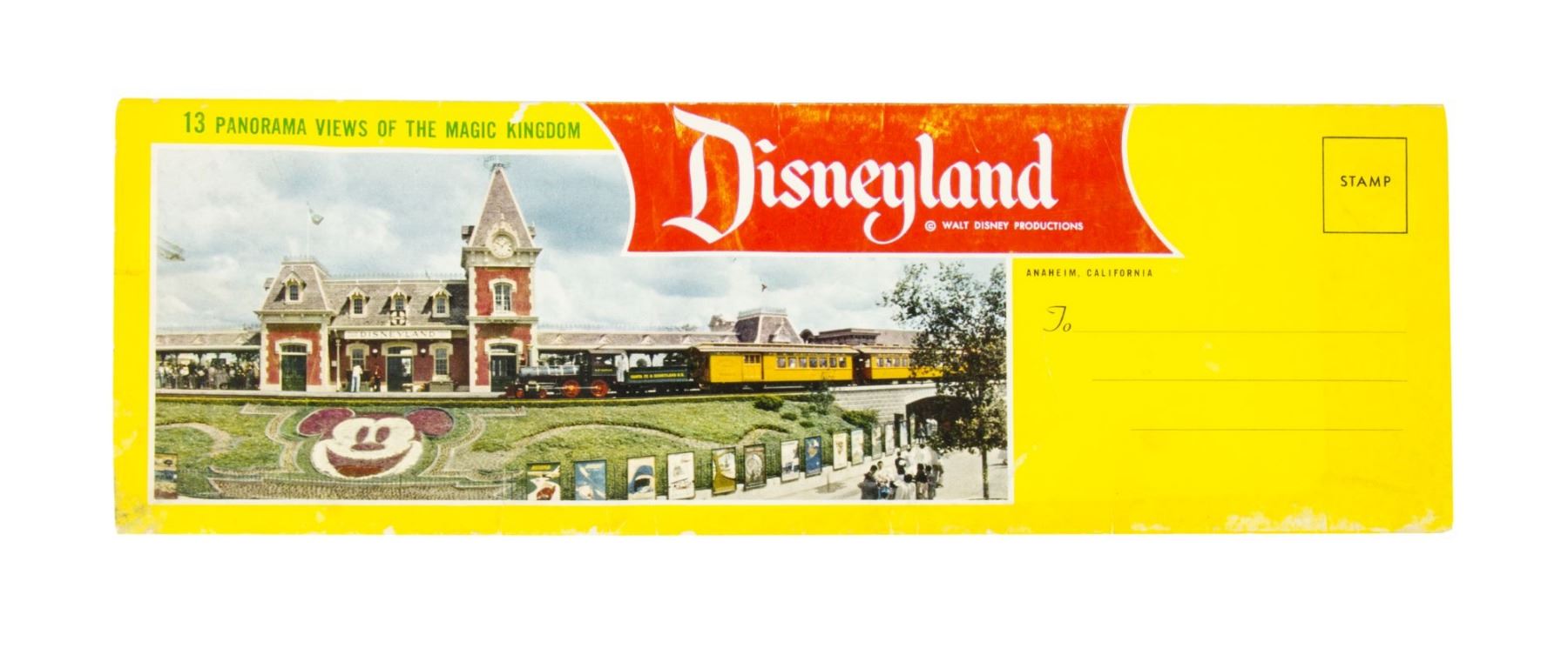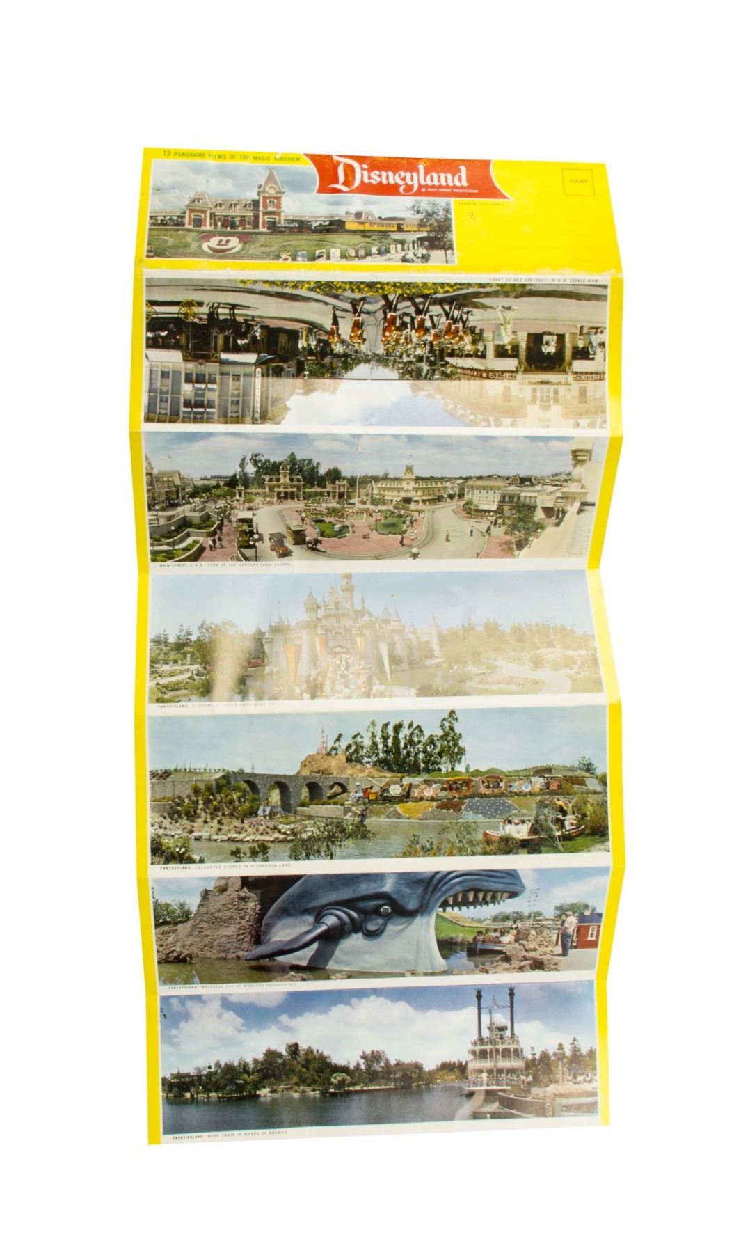 (Disneyland, c.1958) A souvenir mailer titled "13 Panorama Views of the Magic Kingdom". This double-sided mailer unfolds to reveal the 13 beautiful views of early Disneyland and measures 4"x11.75" unfolded. The condition is good with some wear around the edges from use.