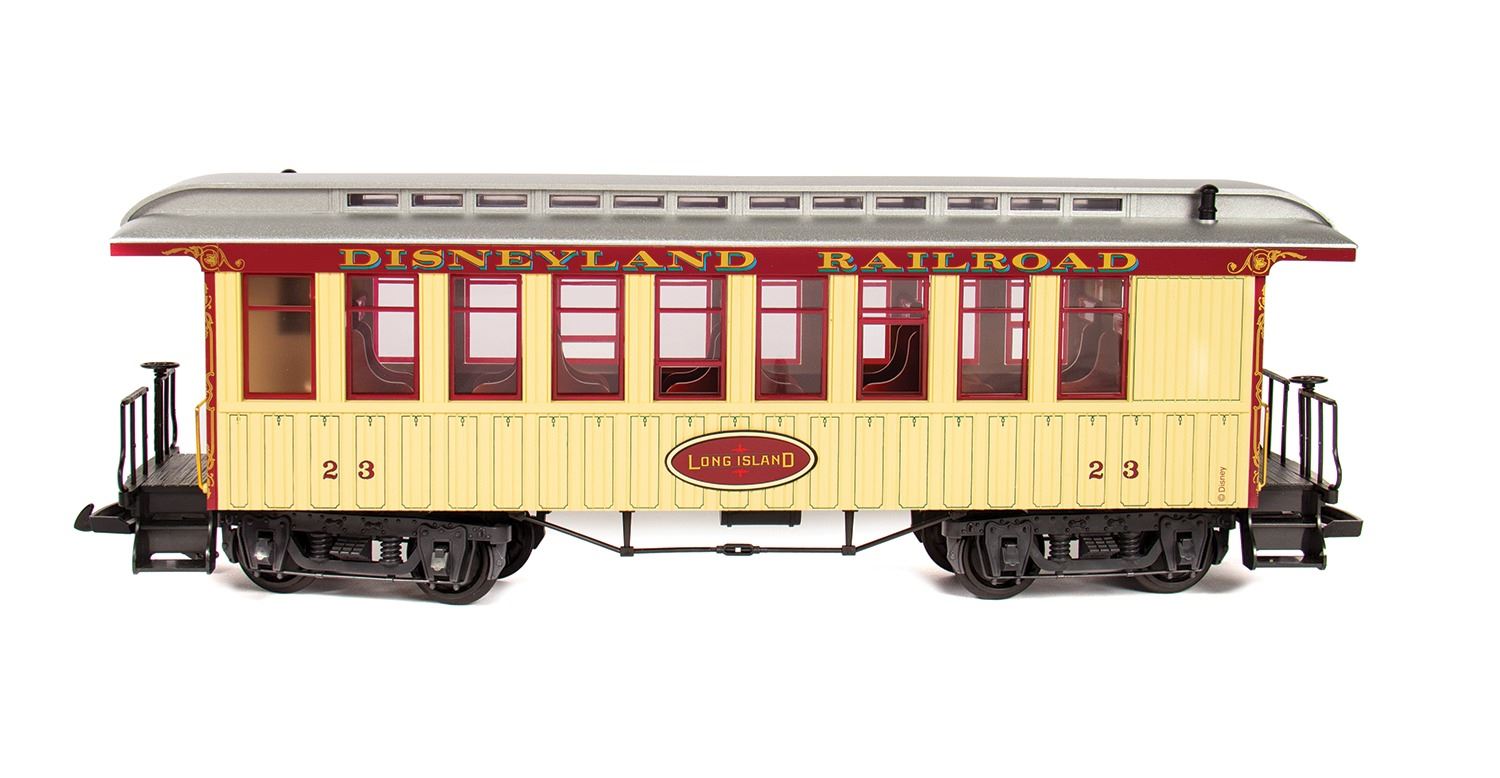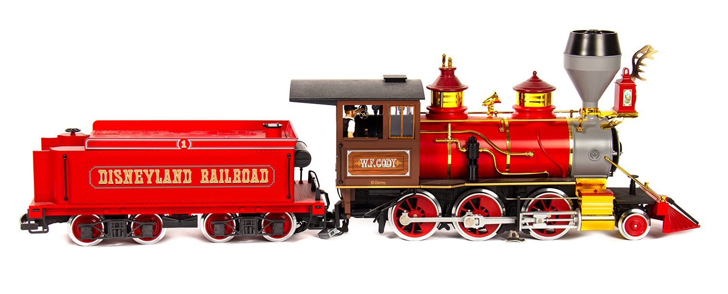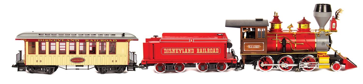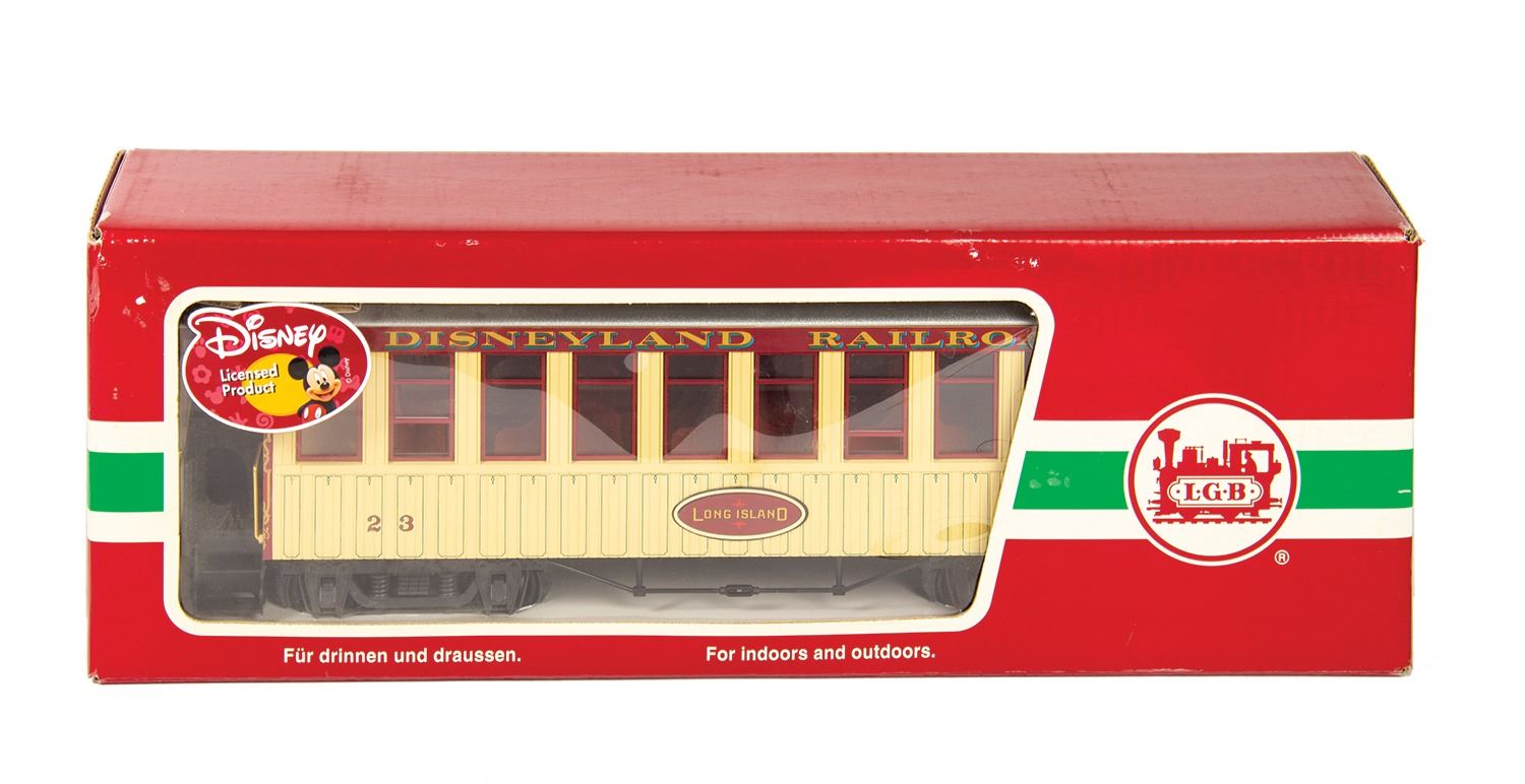 (Disneyland Paris, 2006) A rare Disneyland Railroad locomotive and passenger car made by L.G.B. in Germany. The locomotive is modeled after the W.F. Cody. Both items are G scale models, with the locomotive measuring 26"x4.5" and 7" tall, and the passenger car measuring 17"x5" and 6" tall. Both come in their original boxes and are in fine condition with minor wear.