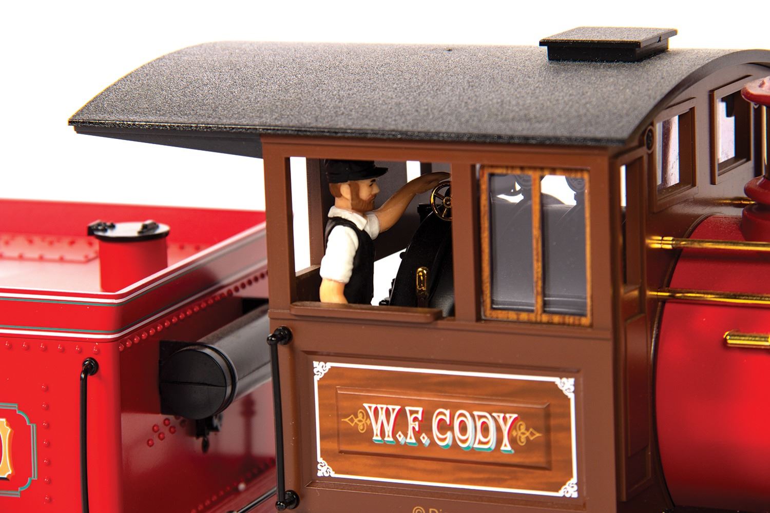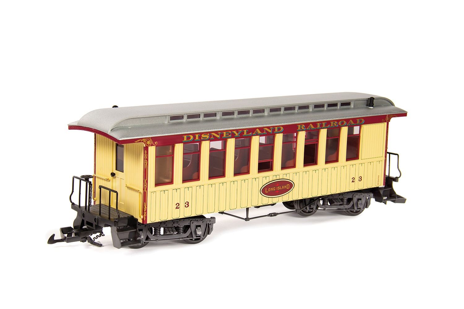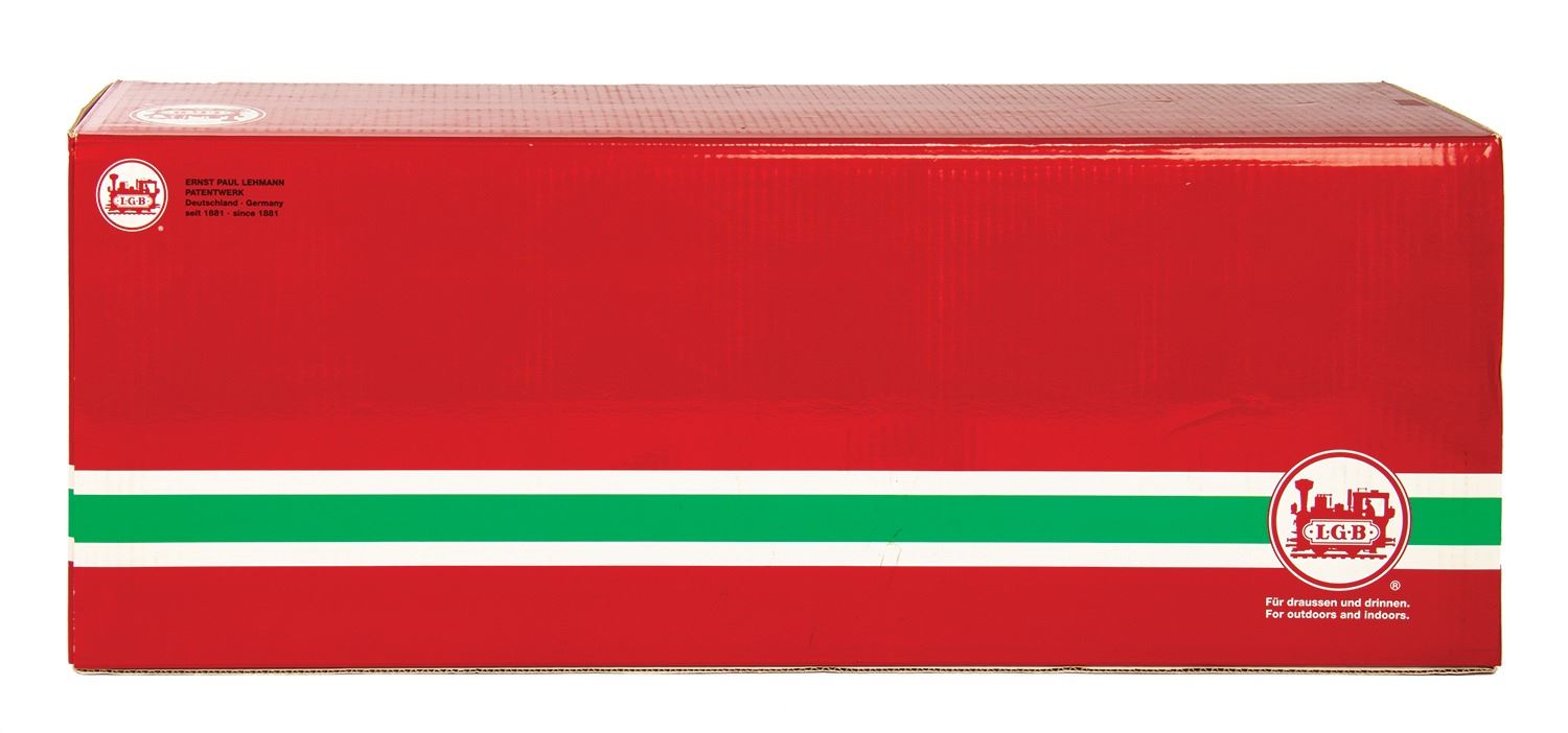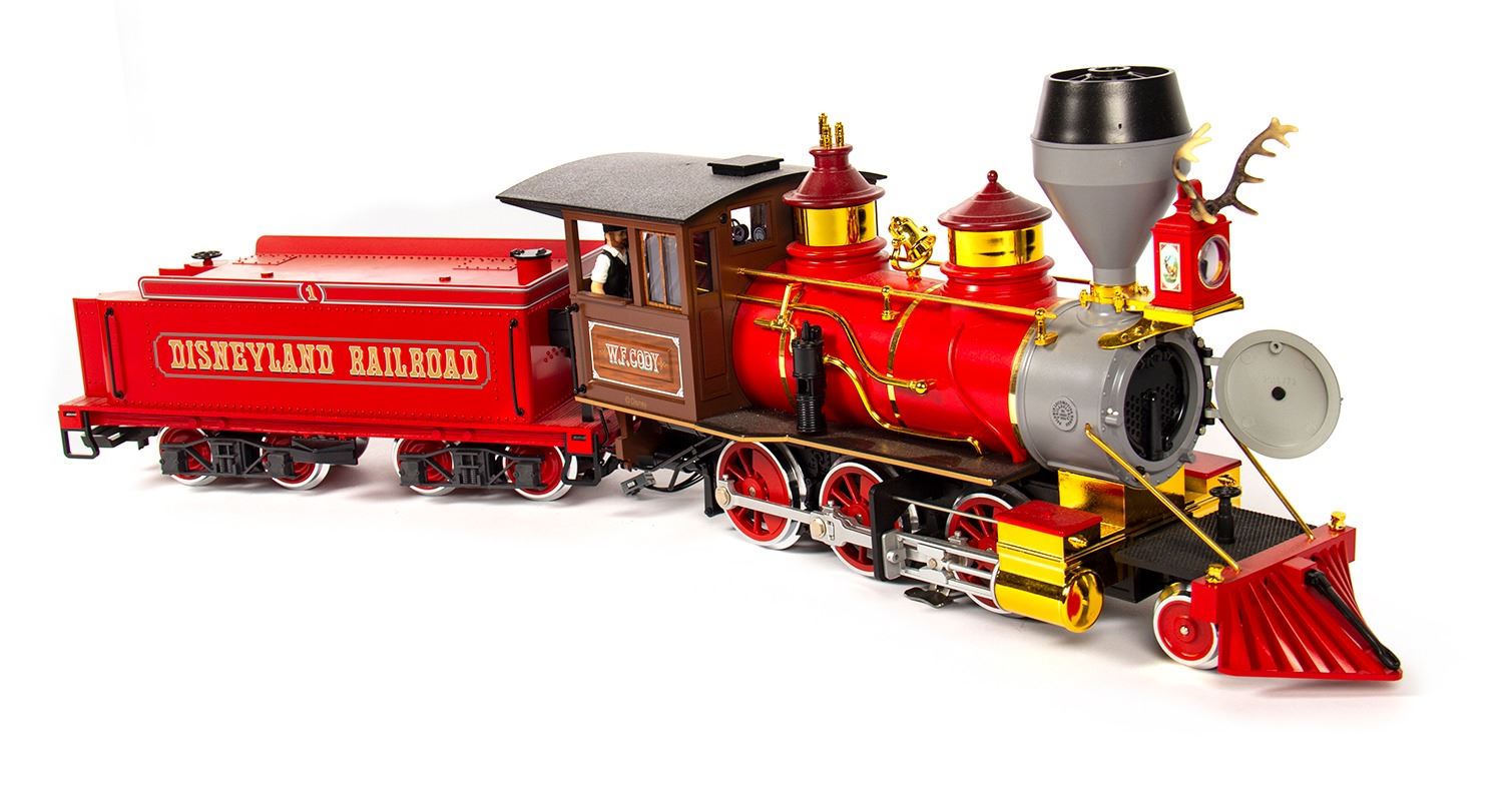 (Disneyland Paris, 2006) A rare Disneyland Railroad locomotive and passenger car made by L.G.B. in Germany. The locomotive is modeled after the W.F. Cody. Both items are G scale models, with the locomotive measuring 26"x4.5" and 7" tall, and the passenger car measuring 17"x5" and 6" tall. Both come in their original boxes and are in fine condition with minor wear.