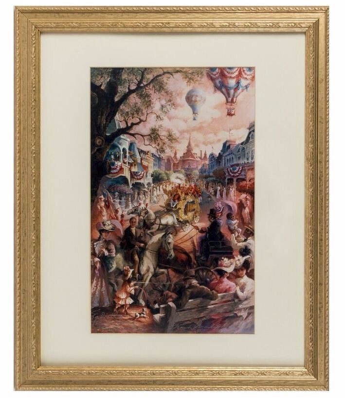 (Disneyland, 1992) A rare concept art lithograph by Frank Armitage featuring an illustration of Main Street at Disneyland Paris. This lithograph is signed and dated by Armitage in the lower edge, and is personalized "For Don & Patty from Disneyland - 31 Years Married". This item measures 18.75"x22.75" and is in very good condition with some wear to the frame including a slightly loose backing.