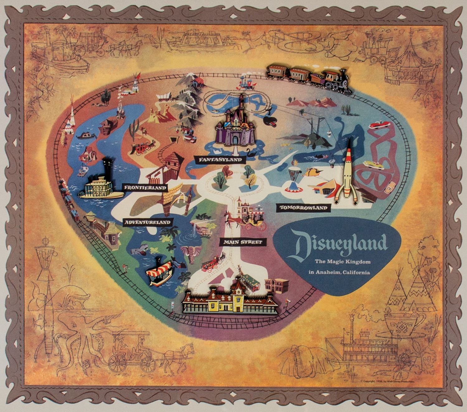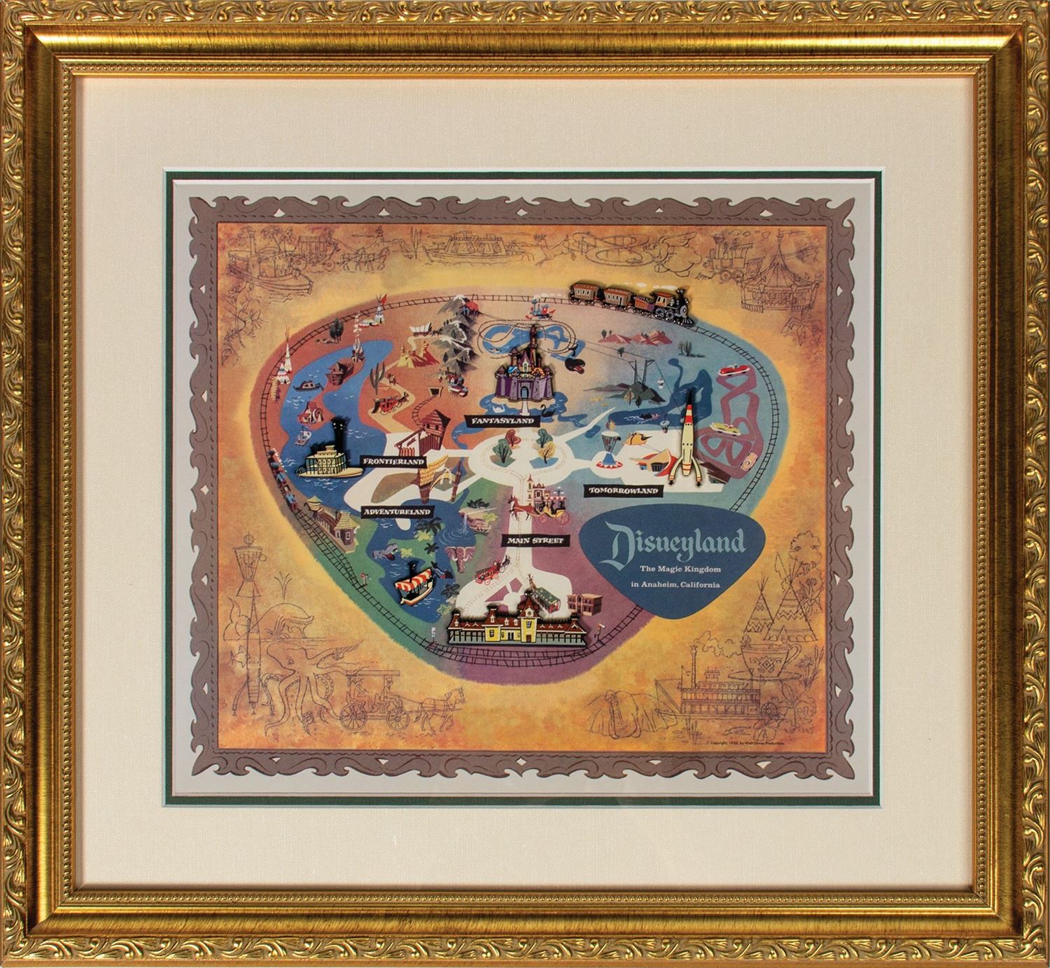 (Disneyland, 2005) A framed pin set commemorating the 50th anniversary of Disneyland, featuring imagery from a 1956 Disneyland promotional brochure. This piece was created in a limited edition of 1500 and contains (6) pins over the map imagery. The pins represent Sleeping Beauty Castle, Jungle Cruise, Mark Twain Riverboat, Main Street Station, Rocket to the Moon, and the Disneyland Railroad. This set measures approximately 10.5"x12" in the 16.5"x18" frame and is in fine condition with little wear. The COA is attached to the reverse of the frame.
