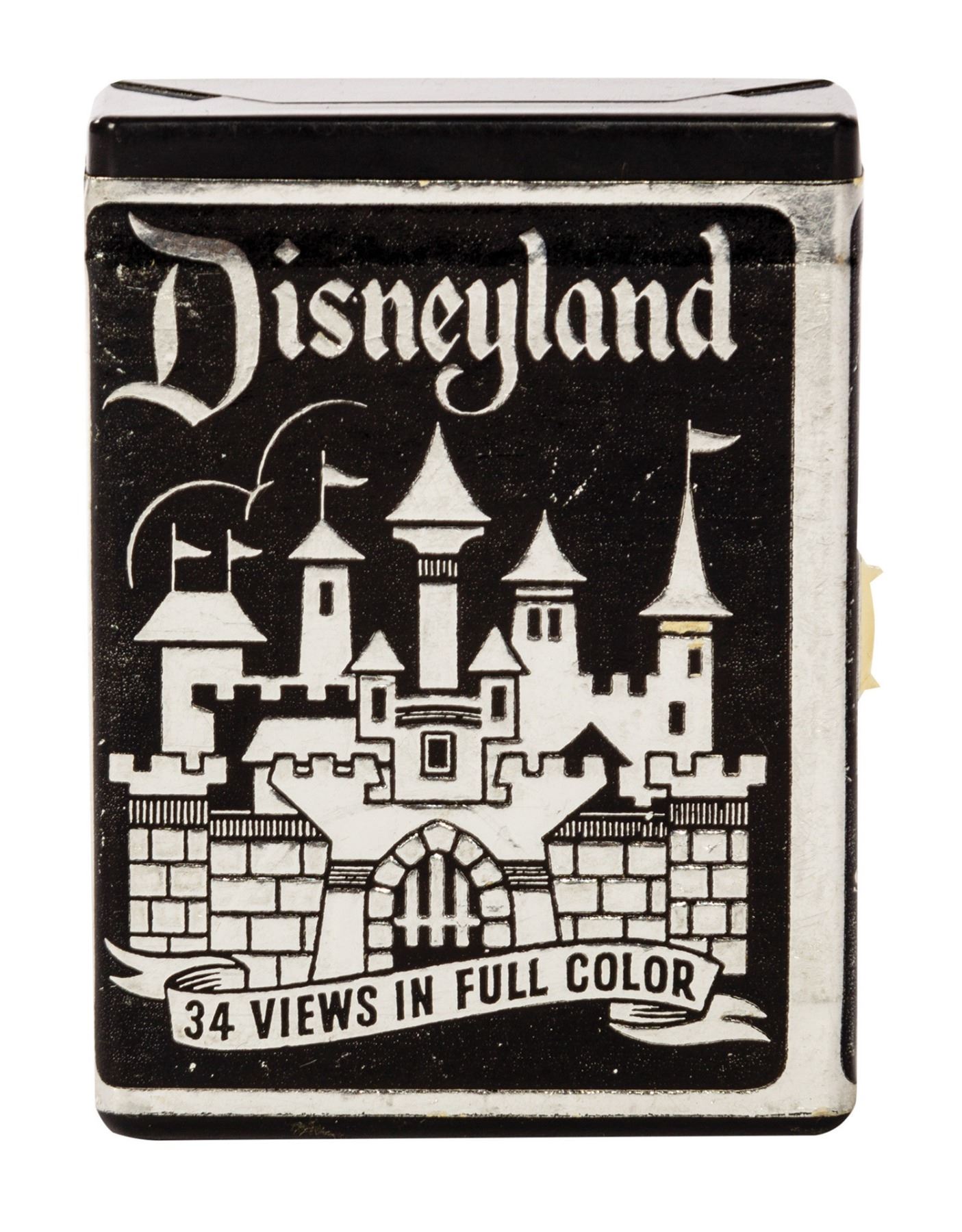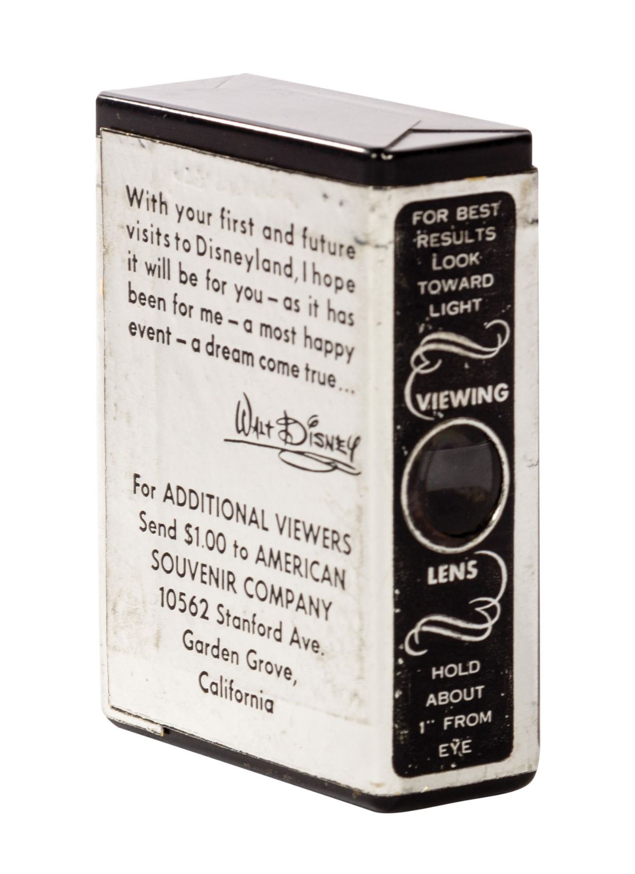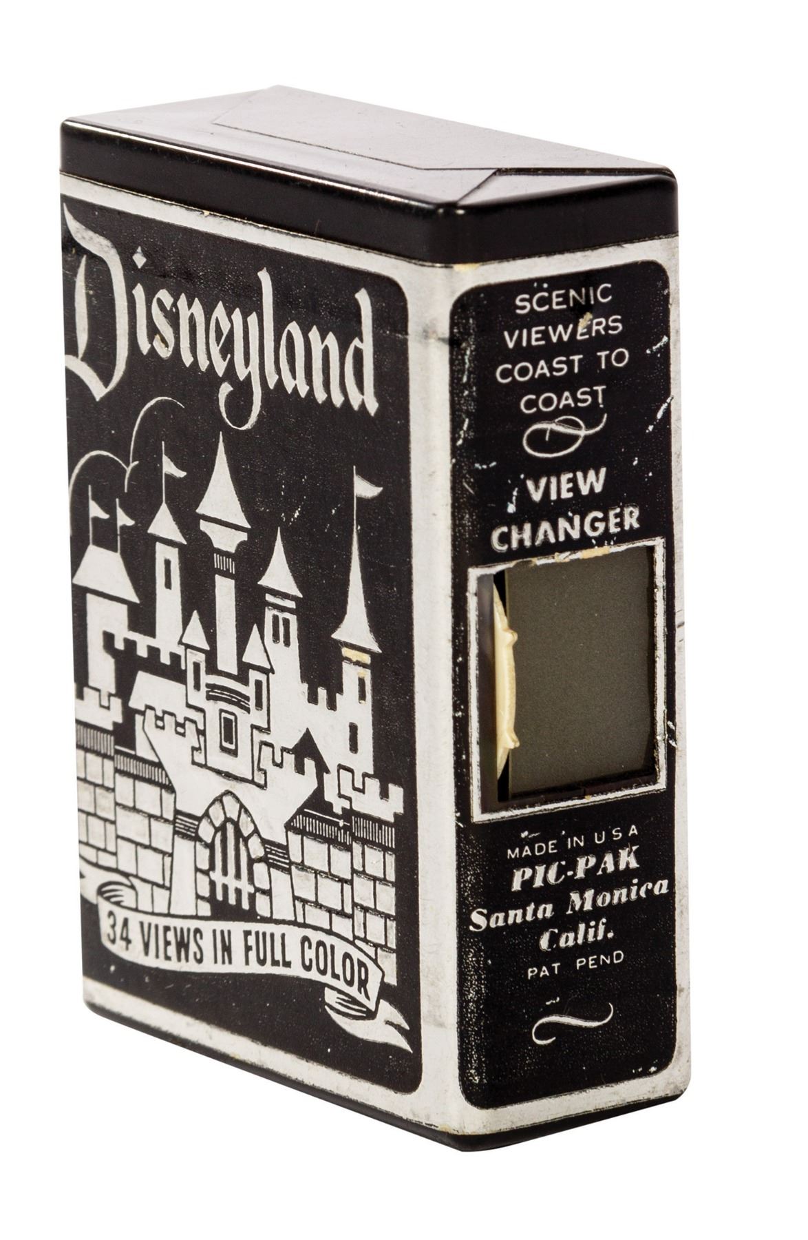 (Disneyland, c.1955) A very rare and unusual slide viewer featuring (34) images from various attractions at Disneyland. This black viewer with a beautiful silver-tone image of Sleeping Beauty Castle on the front, features images from Tomorrowland, Fantasyland, Frontierland, Adventureland, and Main Street. The back of the viewer has a short quote by Walt Disney about first visits to the park and information on how to obtain additional viewers. This viewer measures 2.75"x2" and 0.75" thick, and is in very good condition with some surface wear and scuffing from use.