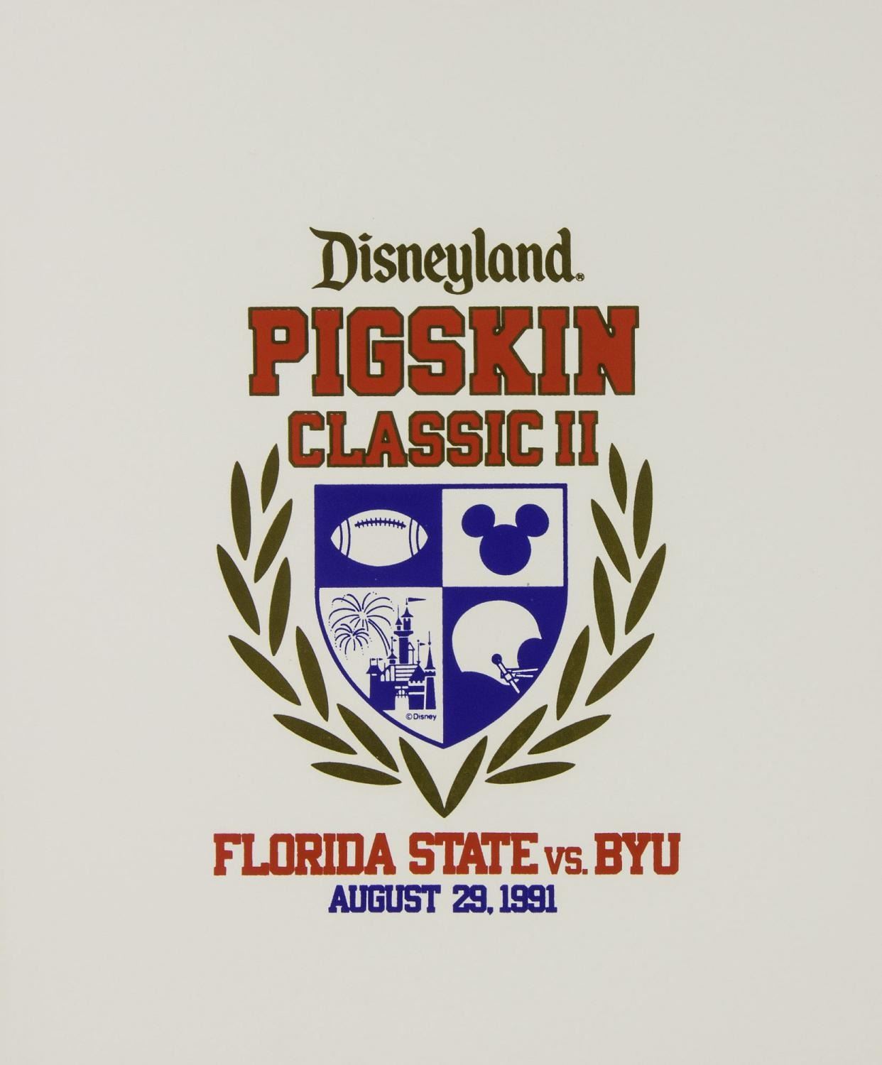 (Disneyland, 1991) A rare poster for the Disneyland Pigskin Classic II between Flordia State and BYU. The Pigskin Classic was a season-opening college football game between 1990-2002. During the first 4 years, this game was sponsored by Disneyland and played at the Anaheim Stadium. Measuring 20" x 16", the poster on heavy cardstock is in very good condition with minor wear from use.