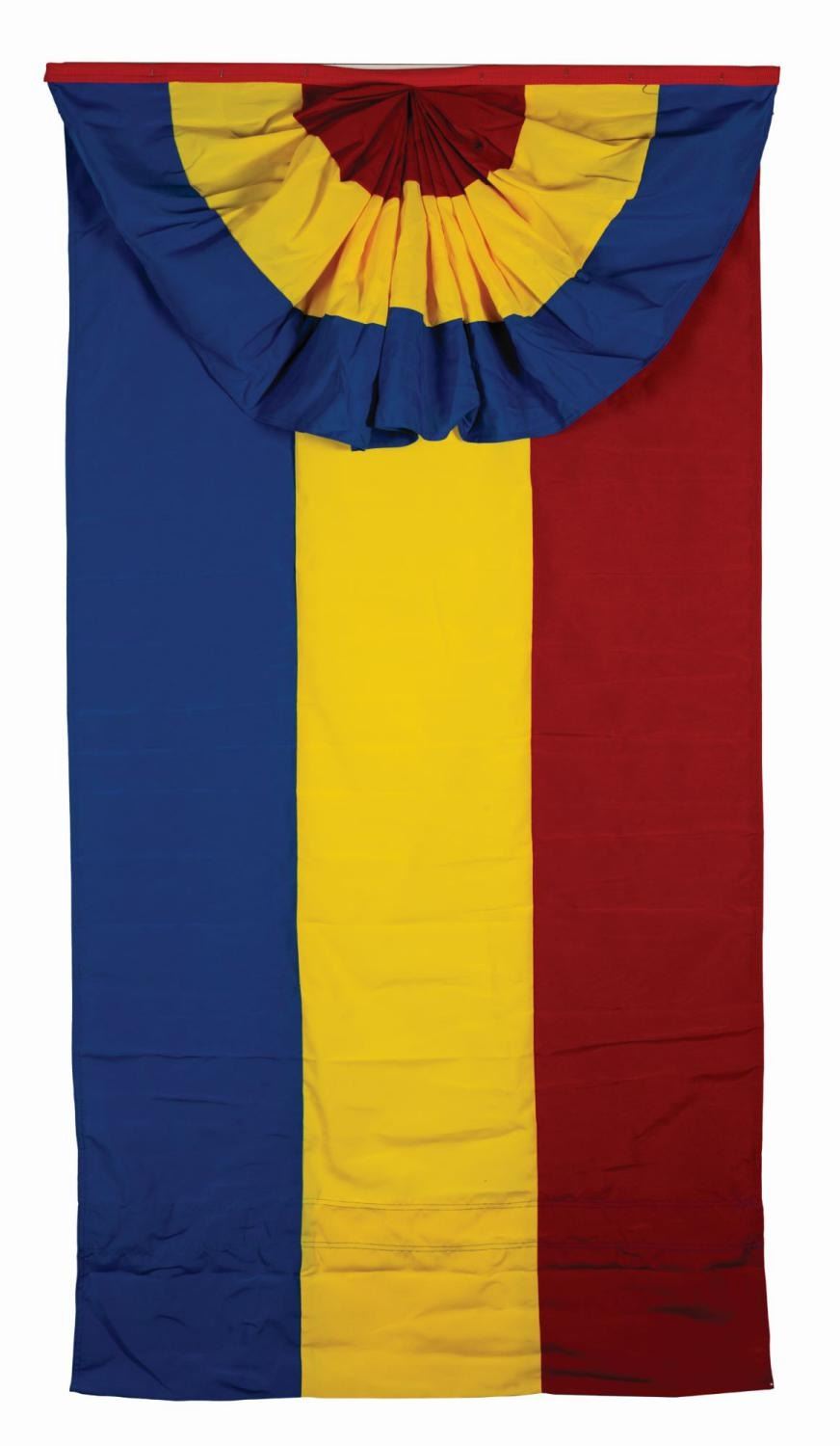(Disneyland, c.2018) A fabric lamppost banner from Disneyland Resort's annual Pixar Fest event. The long fabric banner is affixed to a wooden post for hanging and features segments of joined fabrics carrying the primary color scheme (of blue, yellow, and red) most notably associated with Pixar's Toy Story logo. Matching tricolor ruffled and pleated fabric bunting is joined at the top. Banners like these were readily visible on Main Street U.S.A. during the run of the festival. Measuring 69.5"x36" fully unfurled, the banner is in very good Park-used condition with only light wear from outdoor display.