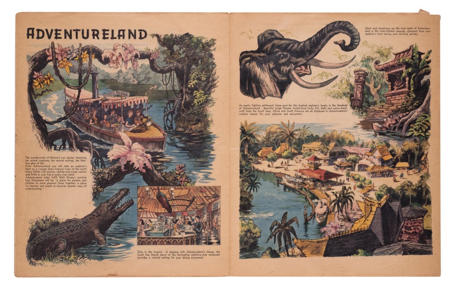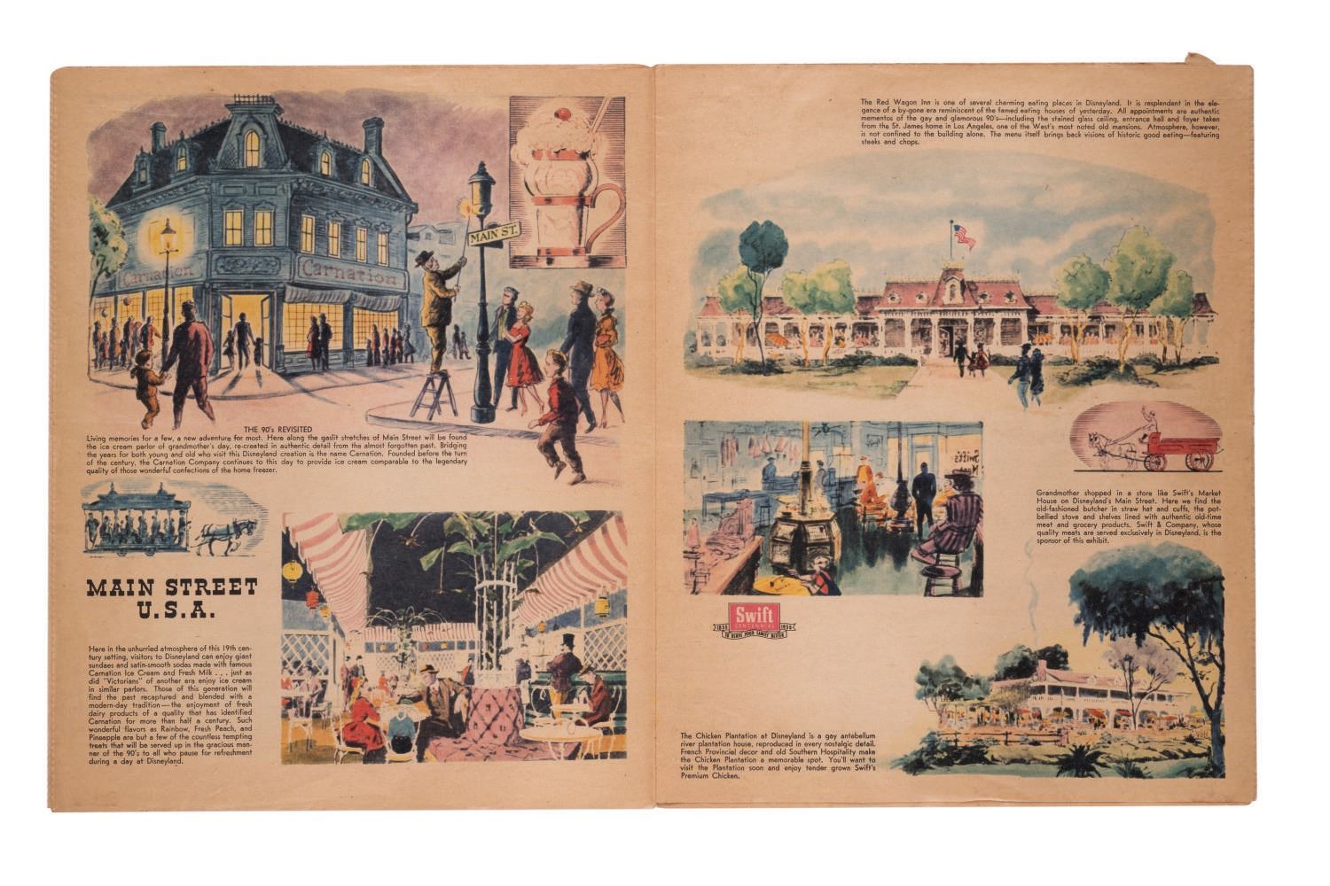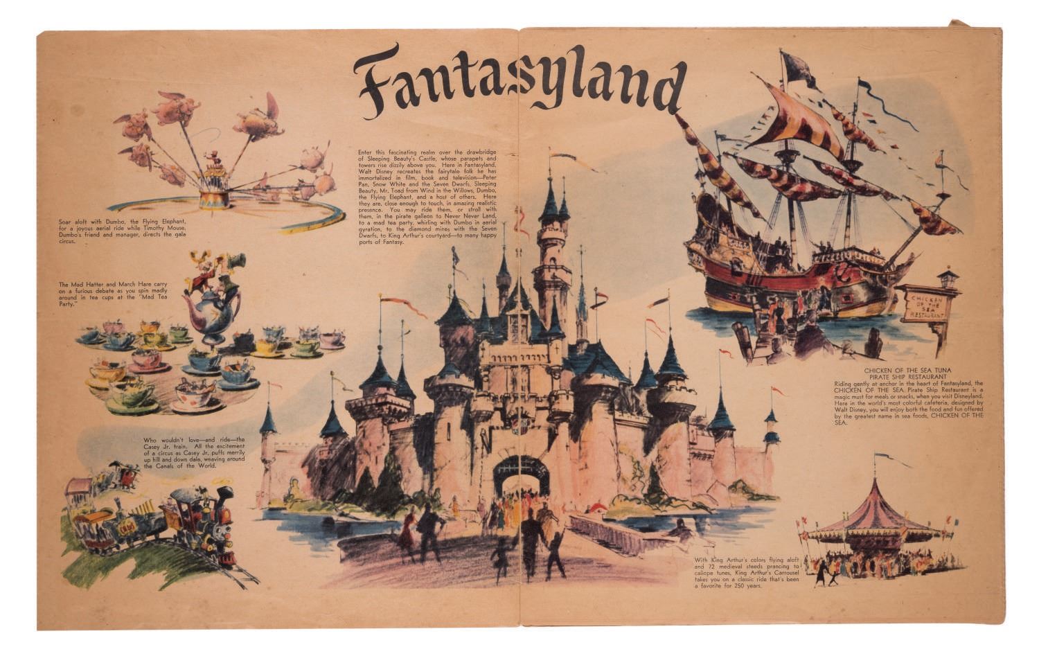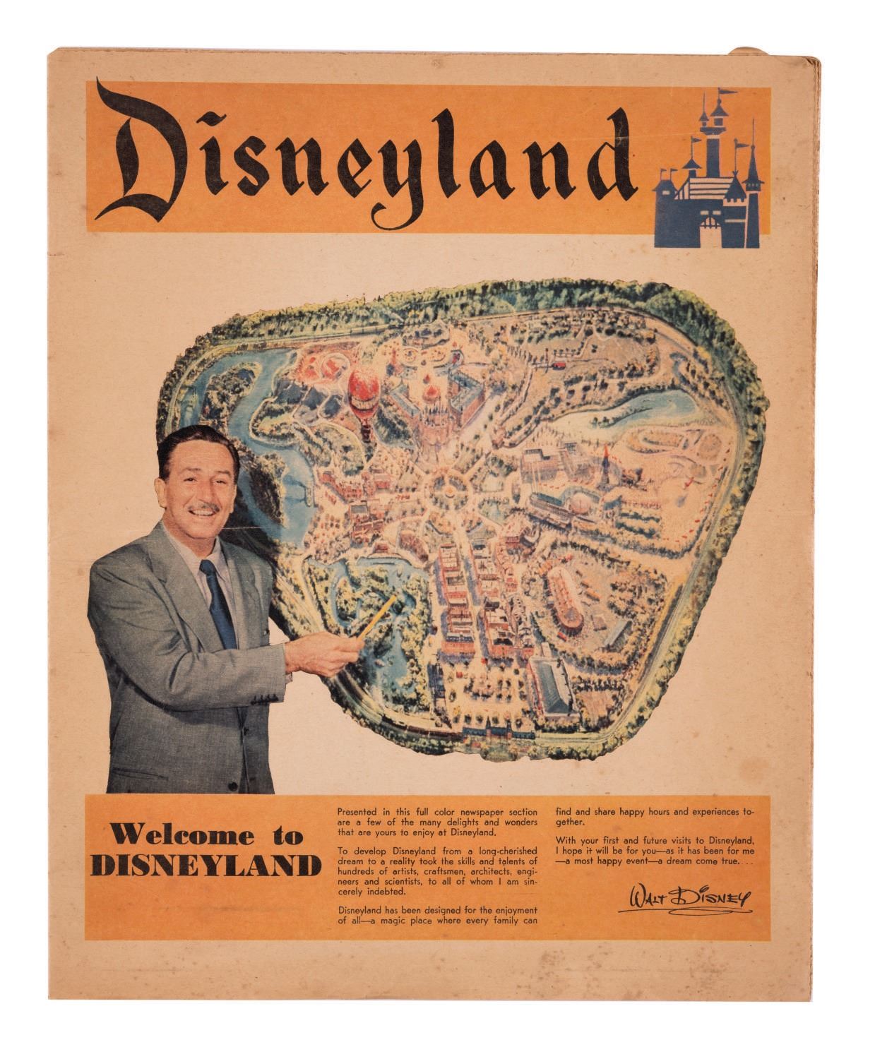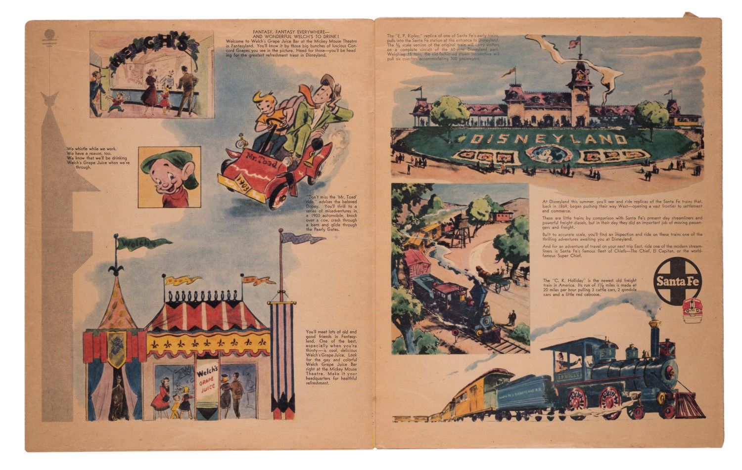 (Disneyland, 1955) This gorgeous full color 20-page newspaper supplement, dated July 15th, 1955, was included in Southern California newspapers two days before the Grand Opening of Disneyland to promote the new Park. The supplement measures 10.75"x13.25" and is in good condition with expected color shift and wear, light spotting, and a 1" tear near the corner of the last page.