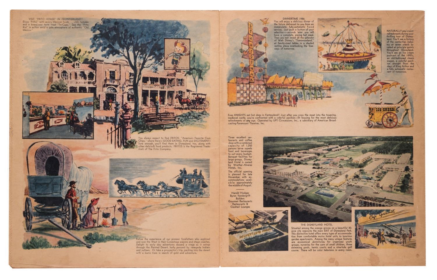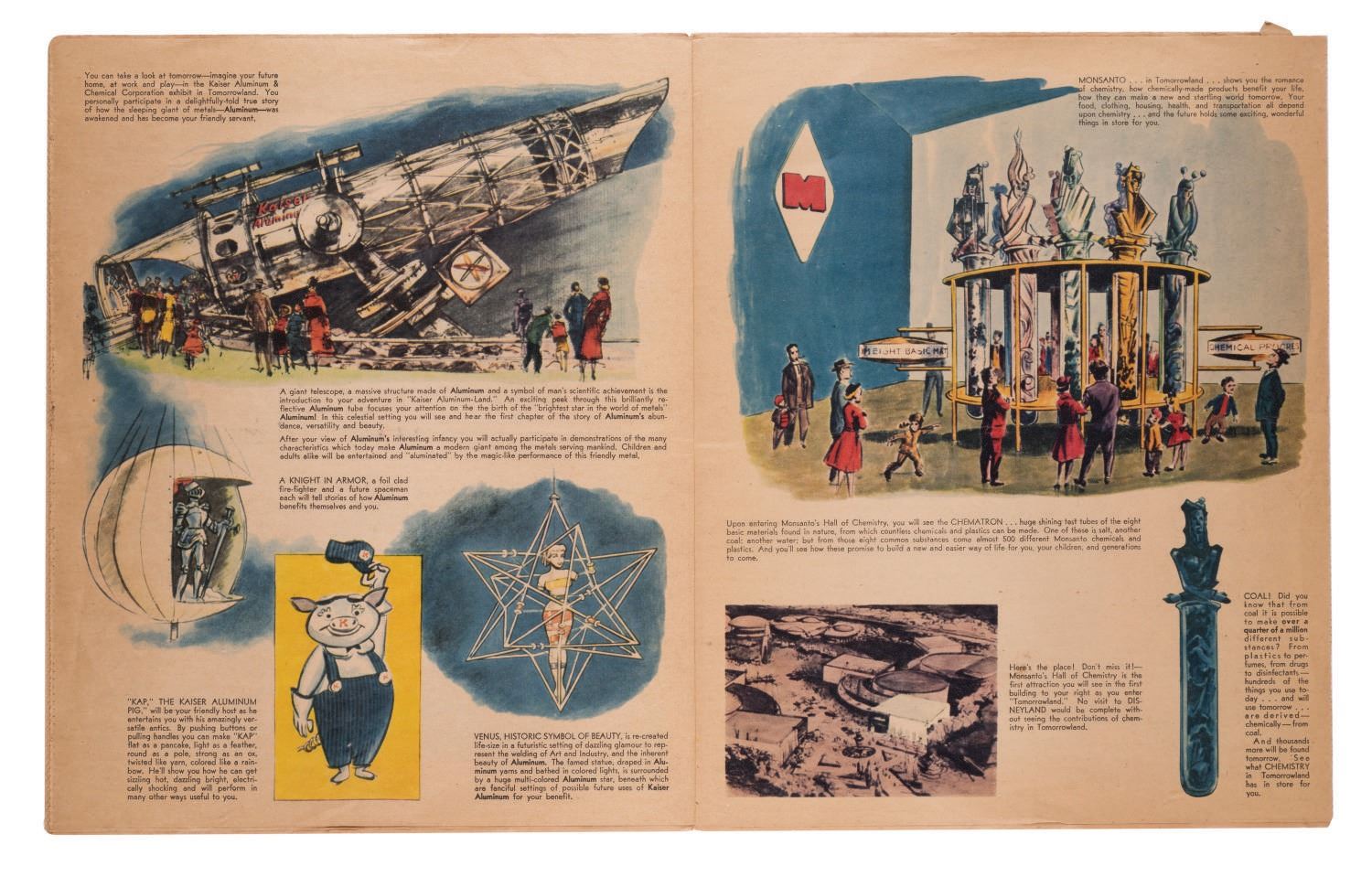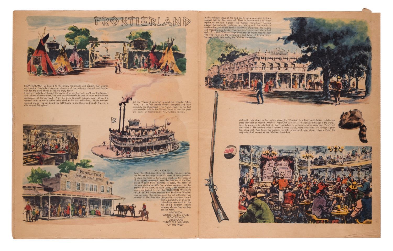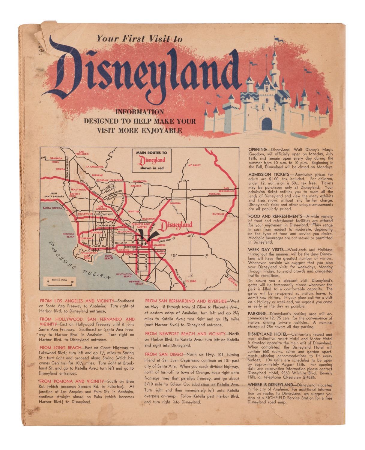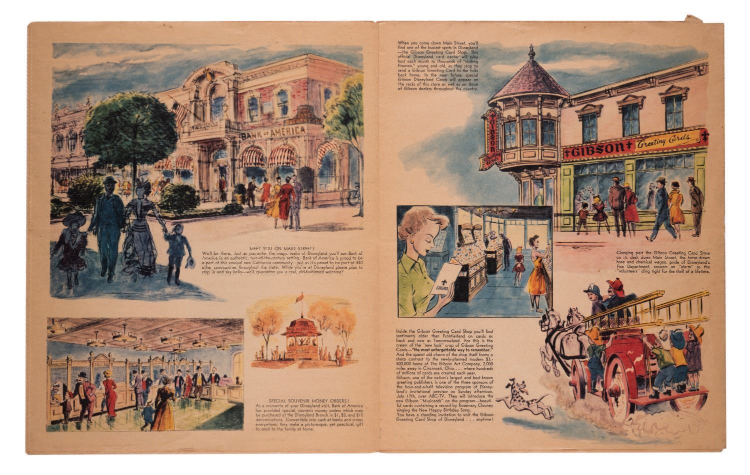 (Disneyland, 1955) This gorgeous full color 20-page newspaper supplement, dated July 15th, 1955, was included in Southern California newspapers two days before the Grand Opening of Disneyland to promote the new Park. The supplement measures 10.75"x13.25" and is in good condition with expected color shift and wear, light spotting, and a 1" tear near the corner of the last page.