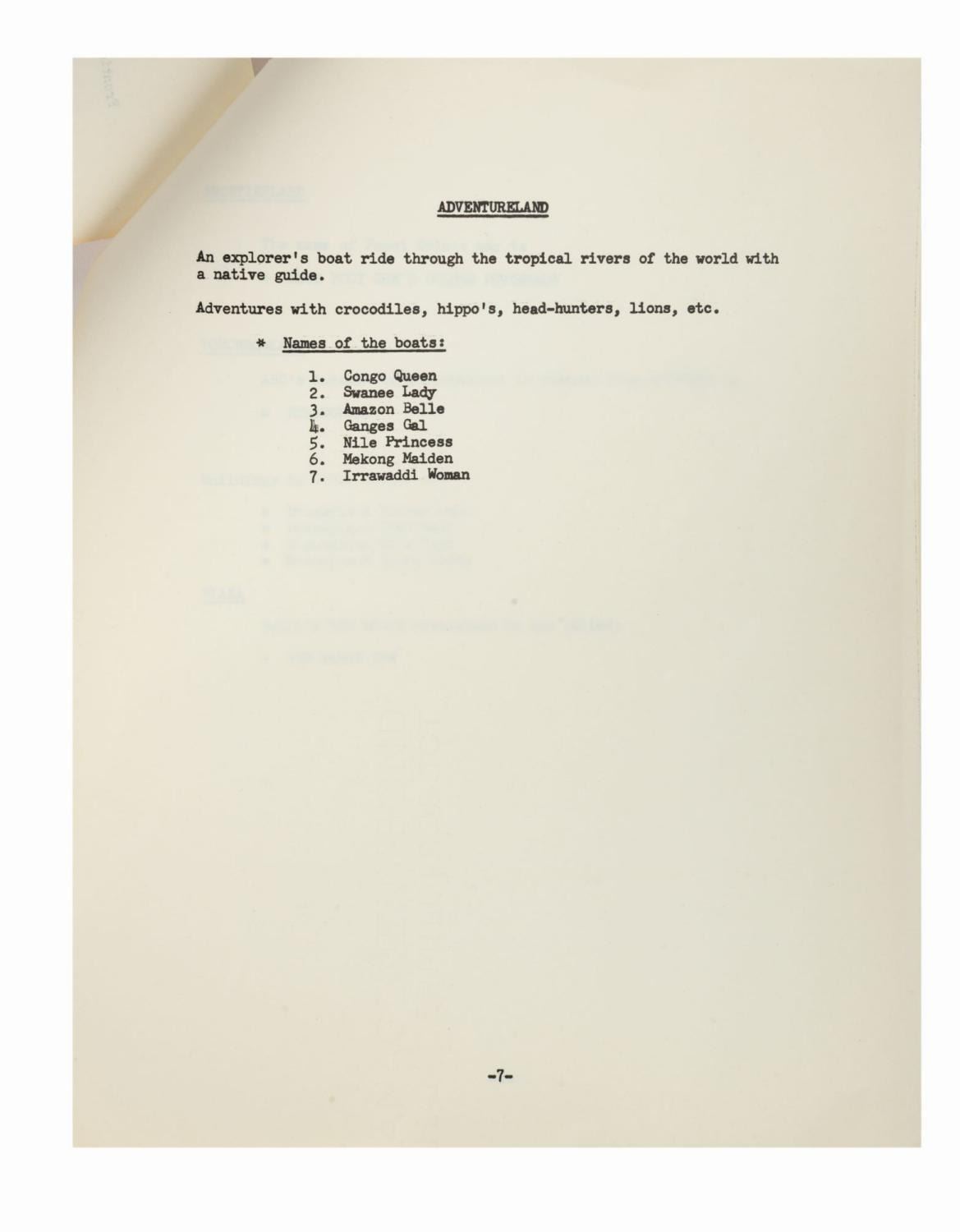 (Disneyland, 1955) A 9-page memo circulated by Bill Cottrell, then president of WED Imagineering, updating the official nomenclature for all the lands and attractions of Disneyland and dated May 25, 1955. The memo provides a summary of every land and attraction in the park, imparting the proper terminology to describe each and furnishing information such as the number of ride vehicles and their names, as well as the back story behind every aspect of the park (e.g. Tomorrowland is set in 1986, the year Haley's comet was due to return). This rare internal document offers fascinating insights into the Imagineers' original intent behind every element of the park on the cusp of the grand opening. Measuring 11"x8.5", the stapled memo is in very good condition with some faint darkening from age, spot soiling, surface impressions, corner wear, and handling.
