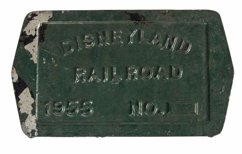 (Disneyland, 1955) An extremely rare park-used metal bolster plate from the "Disneyland Railroad". This bolster plate reads "Disneyland Railroad 1955" in raised letters and on the base, the note "203 R - Engineer Side" is written in partially-faded ink. This item measures 5.5"x9.5" and is in good condition with some wear throughout from years of park-use.