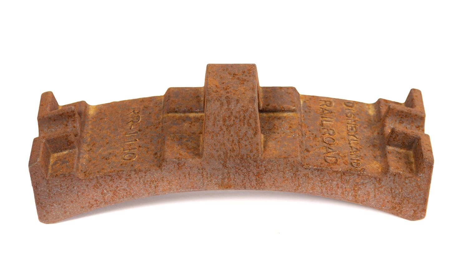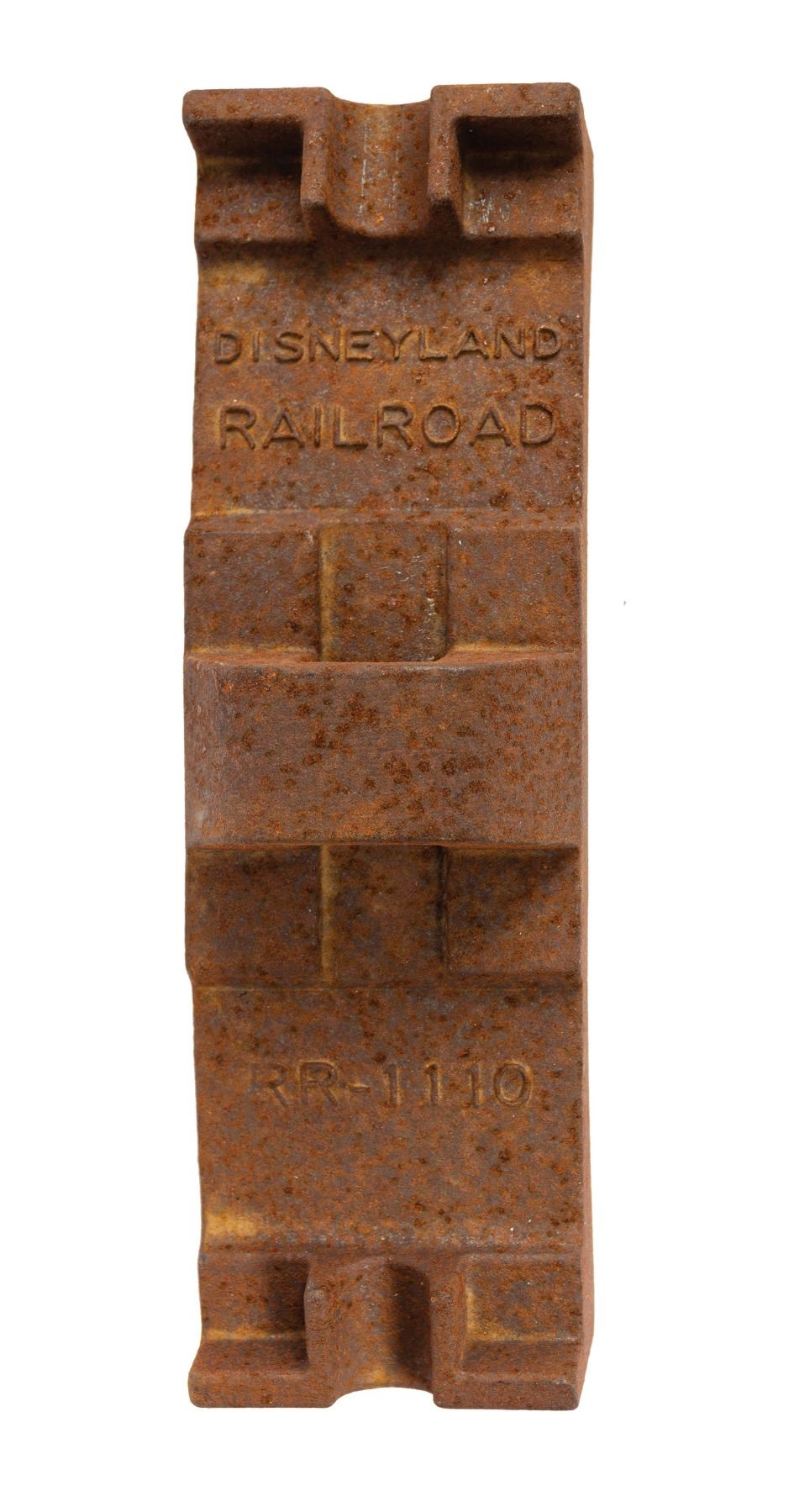 (Disneyland, c.2000s) An original steel brake shoe created for the Disneyland Railroad. The brake shoe assists in the overall breaking system for the train, and this brake shoe features raised letters that read "Disneyland Railroad" on the surface. This shoe was an extra that was never actually installed within the Disneyland Railroad, so it remains a great example of a rarely seen functional piece of this iconic park attraction. Measuring 9"x2.75" and 3.25" tall, the brake shoe is in good condition overall with some rusting to the surface of the metal from age.